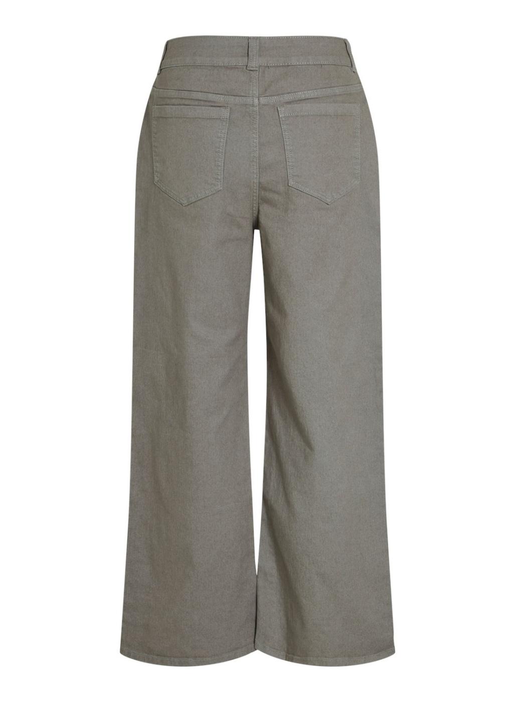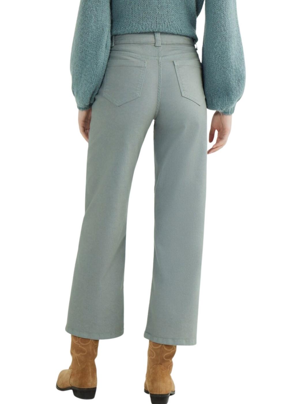 Calça Vila. Modelo Viemma. Cor verde. Cintura alta. Fechamento com botão e zíper. Cinco bolsos. Perna larga. Comprimento até os tornozelos. Corte palazzo.