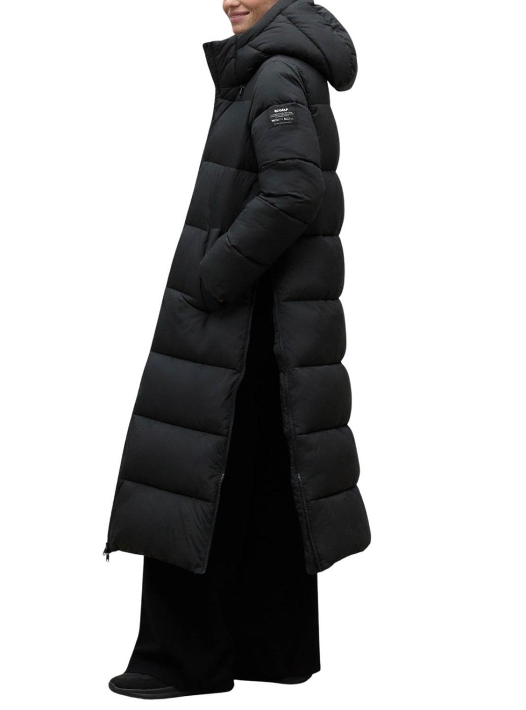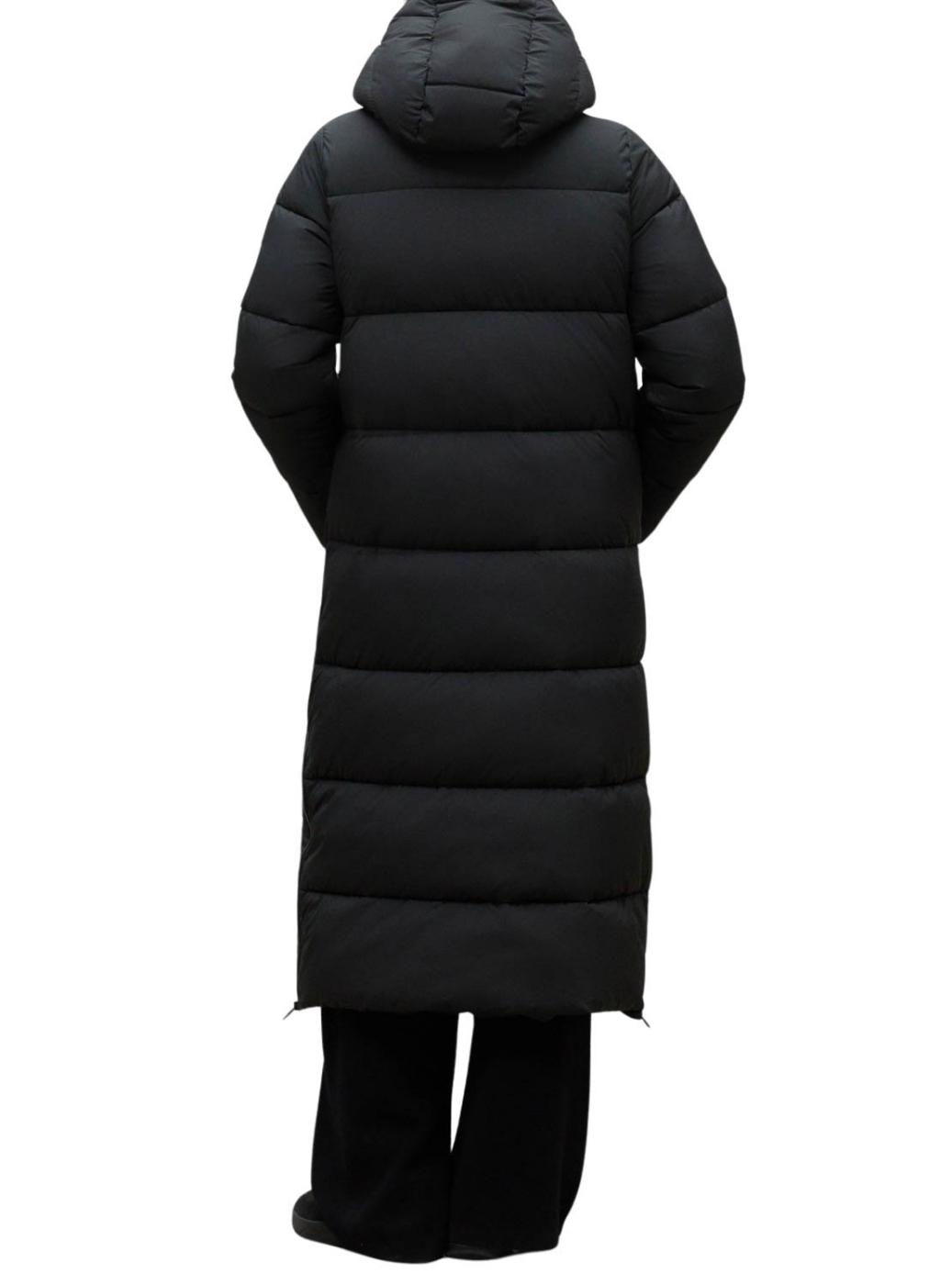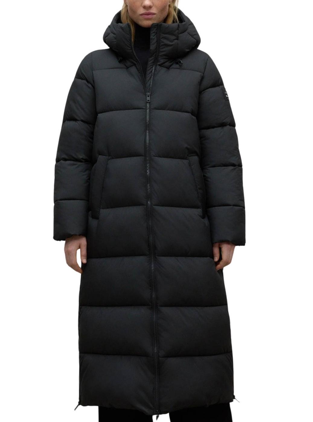 Casaco acolchoado Ecoalf. Modelo Binaiaalf. Cor preta. Gola alta com capuz. Fecho de correr bidirecional. Aberturas laterais com fecho de correr. Corte longo. Bolsos laterais. Pedaço da marca na manga. Acolchoado com enchimento vegano.