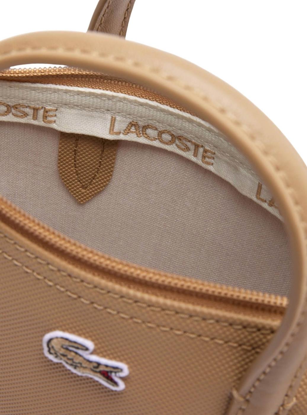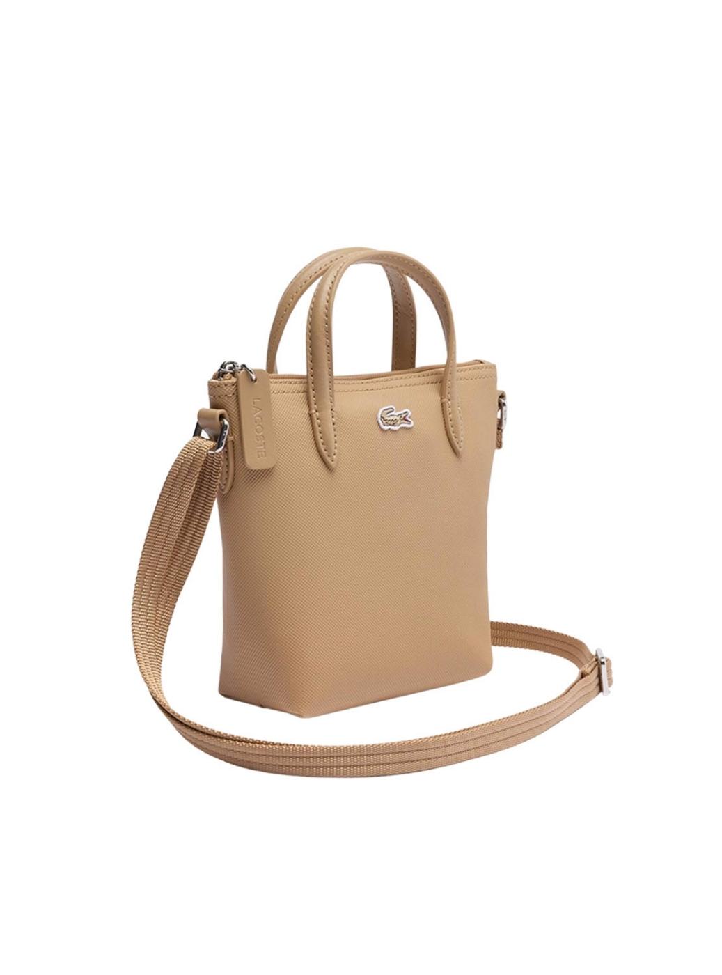 Bolsa Lacoste. Modelo Tote mini. Cor bege. Fechamento com zíper. Alça de mão. Alça ajustável. Patch bordado de Croco. Textura de piqué. Dimensões: 15 × 18 × 7 cm.