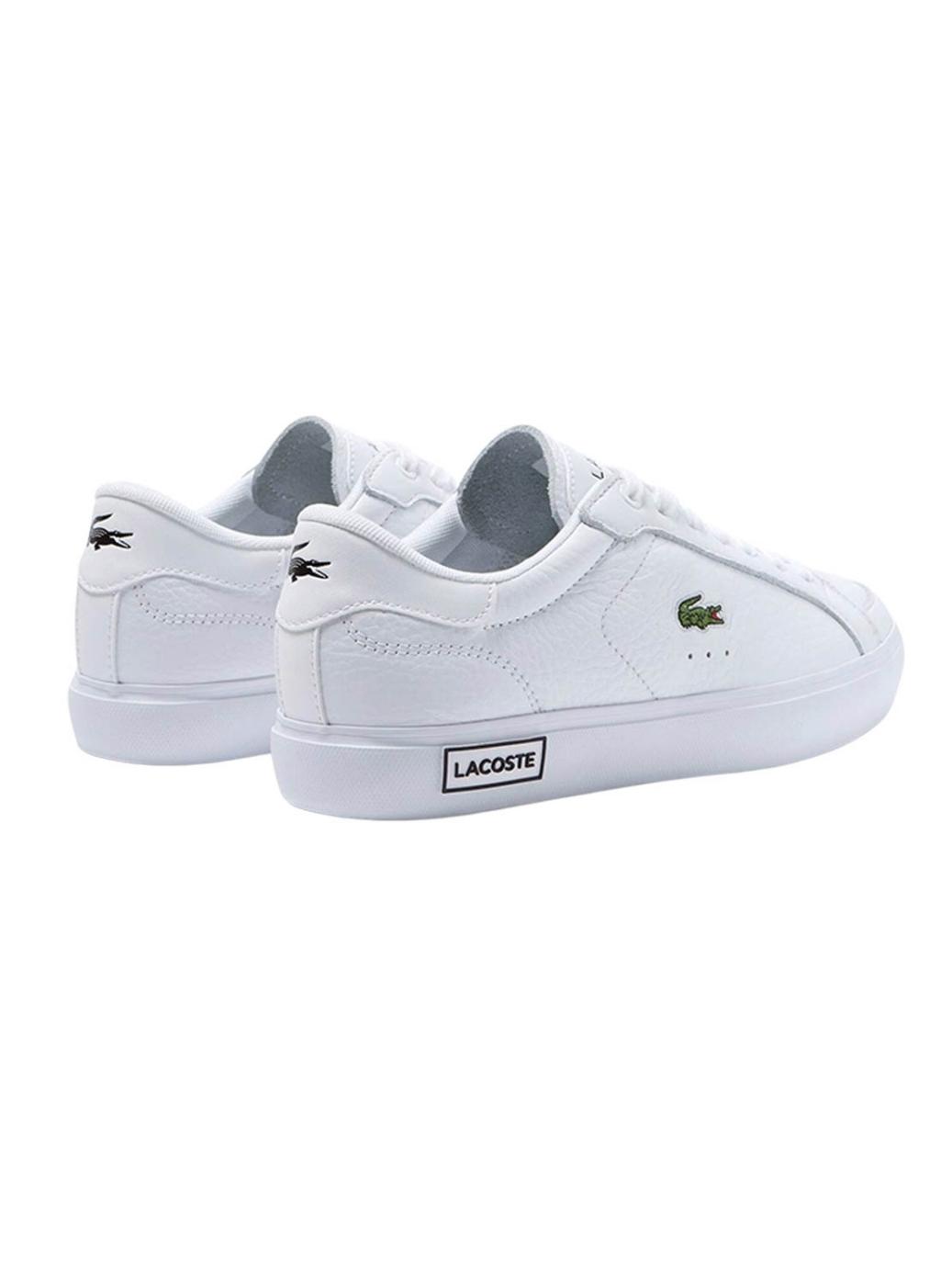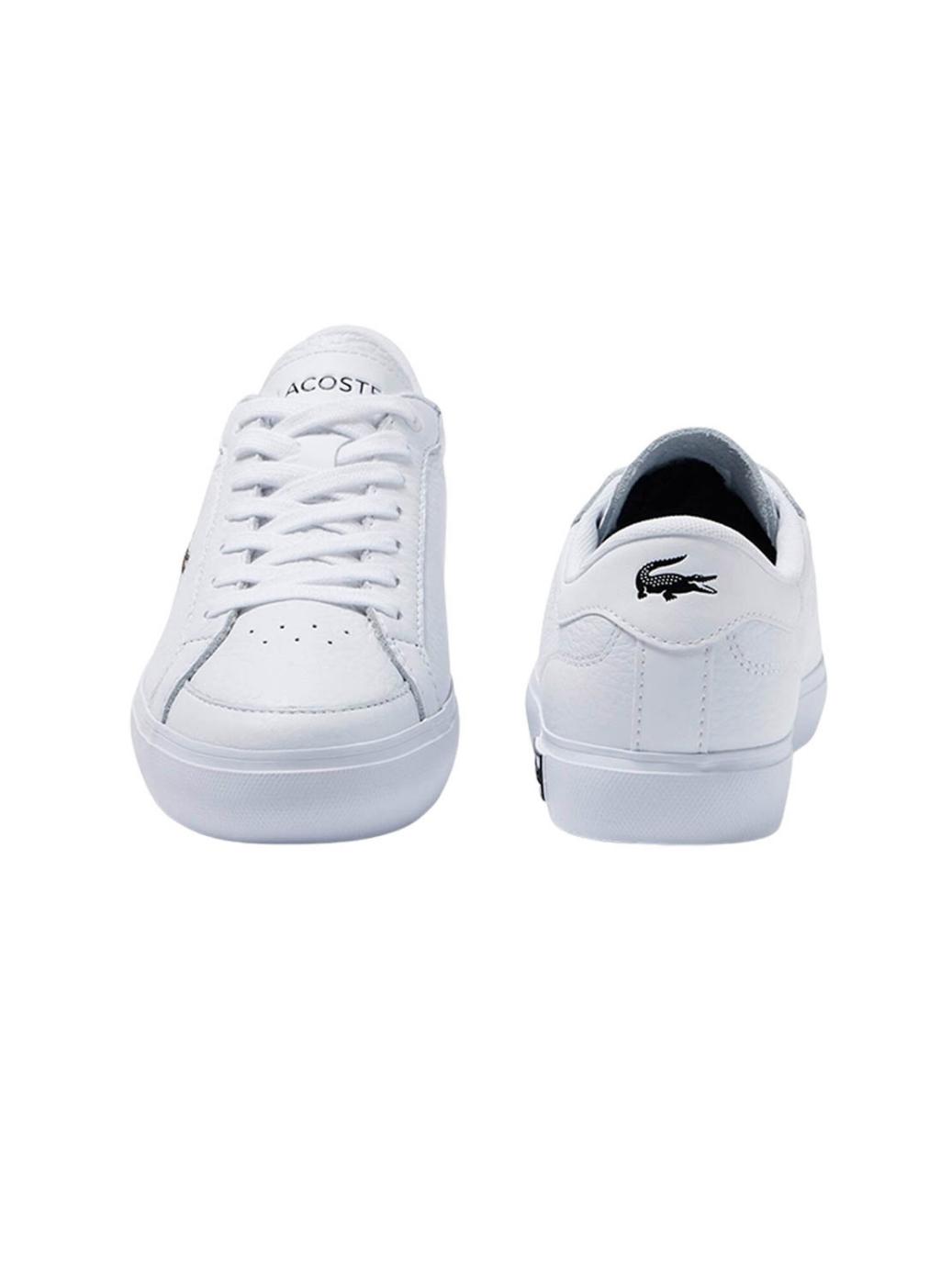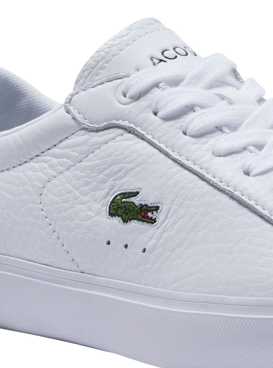 Ténis Lacoste. Modelo Powercourt Croco. Cor branca. Fecho com cordões. Sola de borracha. Crocodilo lateral na cor original. Marca na entressola.