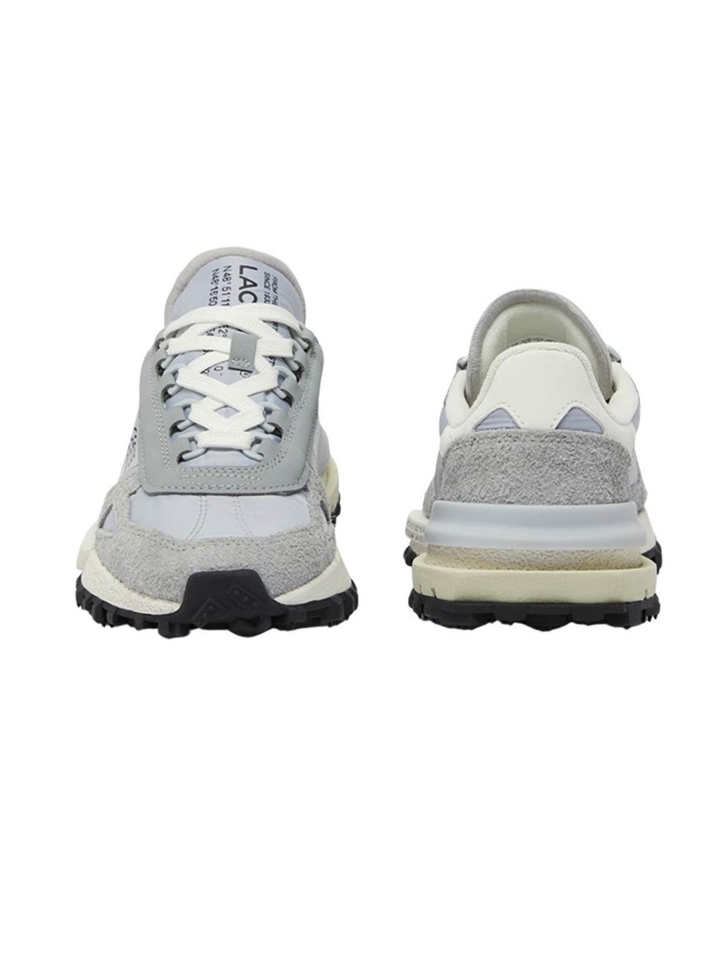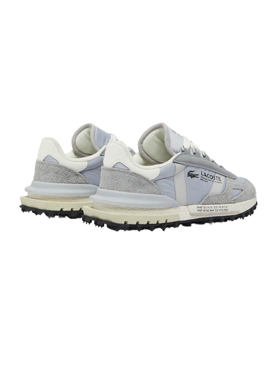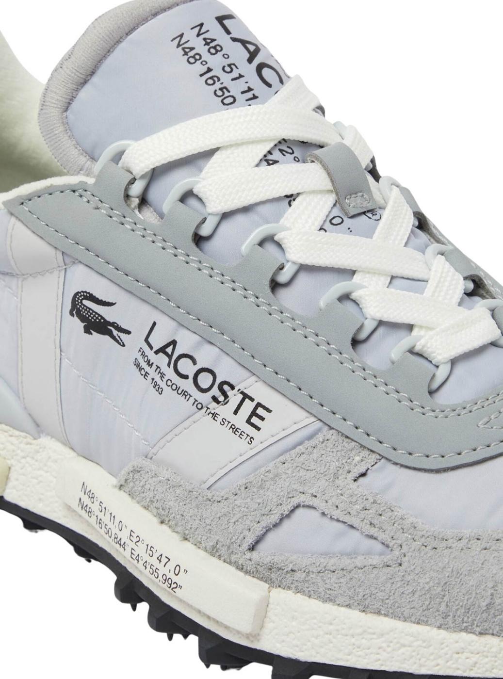 Sapatilhas Lacoste. Modelo Elite. Cor cinza. Painéis de camurça com efeito envelhecido. Painéis de Nylon. Marca e coordenadas estampadas no lateral. Entressola de EVA granulado. Sola de borracha antiderrapante. Fecho com cordões.