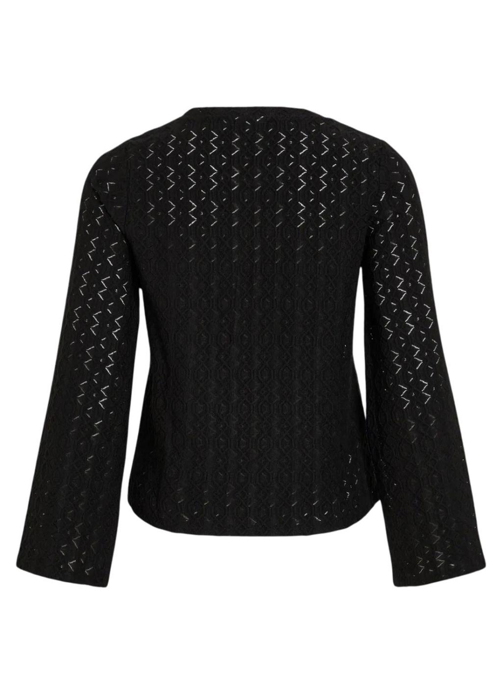 Top Vila. Cor preta. Manga comprida flare. Tecido texturizado. Gola redonda. Corte regular. A modelo veste o tamanho S.