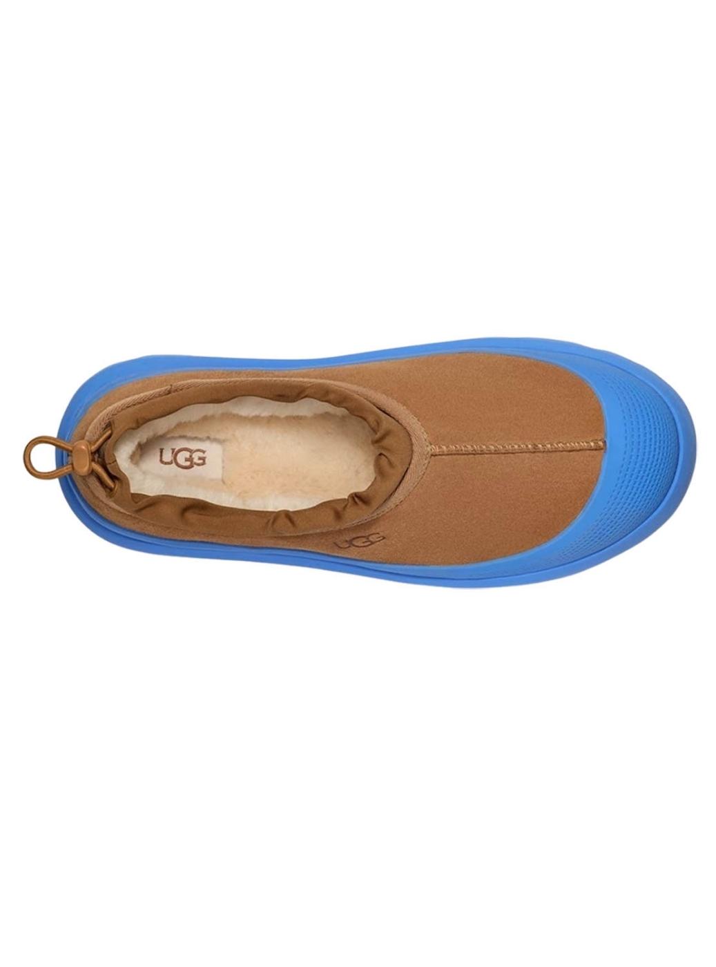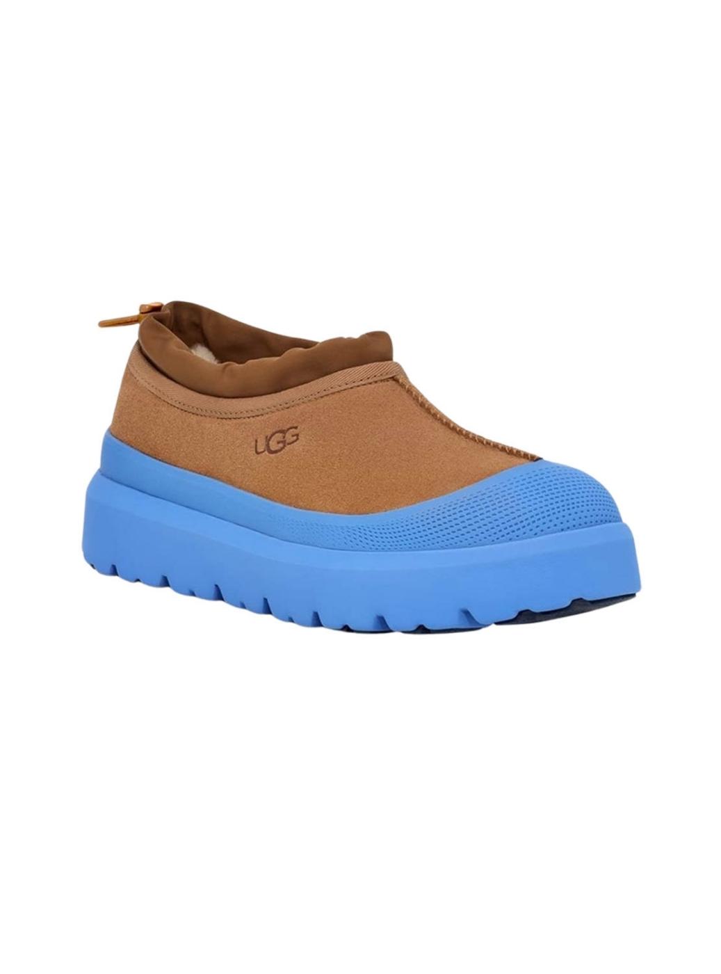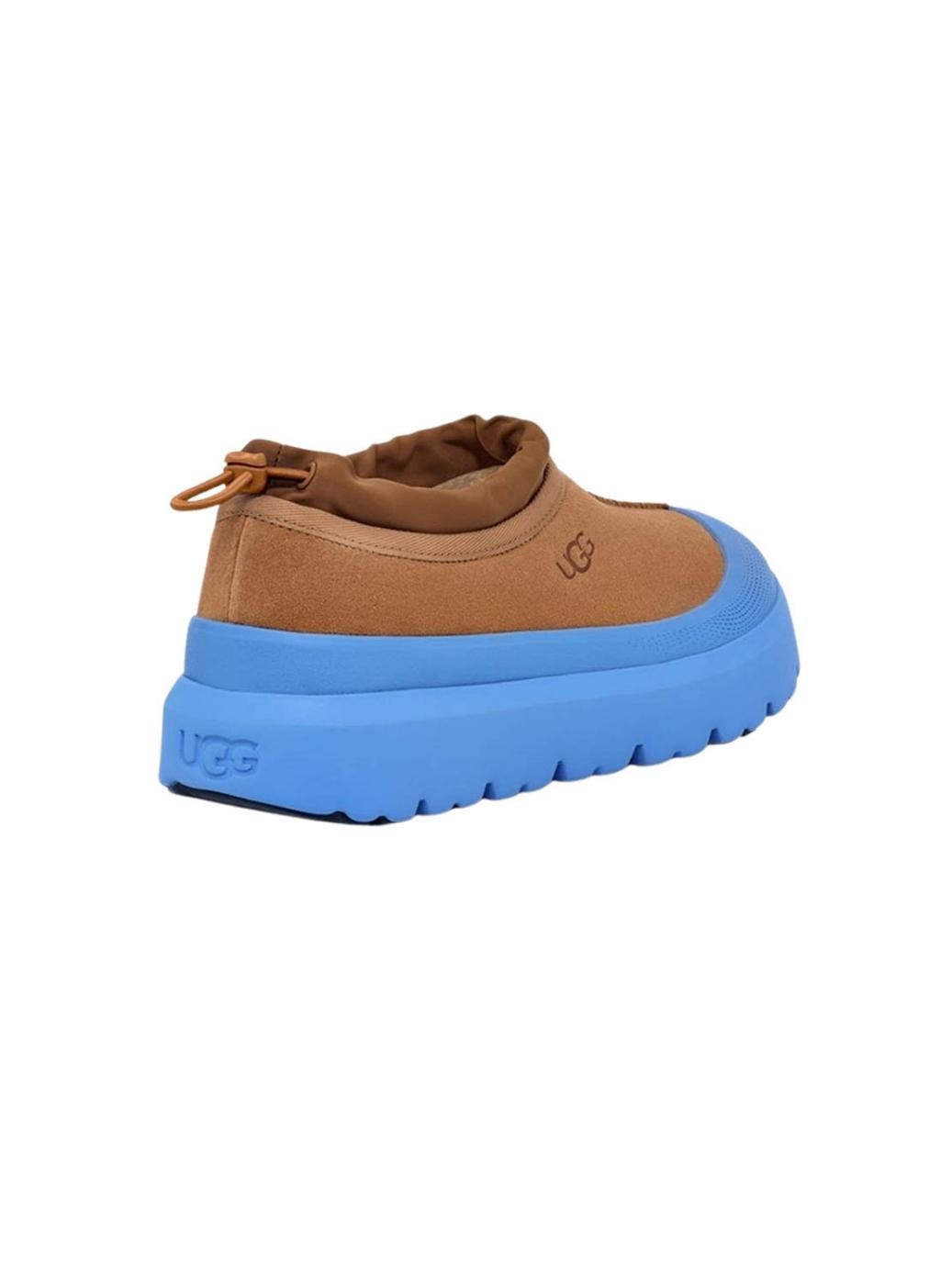 Sapatilhas Tasman Weather Hybrid. Cor camelo com detalhes em azul. Tecido de camurça impermeável. Costuras seladas. Forro de lã reciclada UGGplush. Toque leve. Sem cadarços. Palmilha contornada de borracha EVA. Logo UGG termograbado.