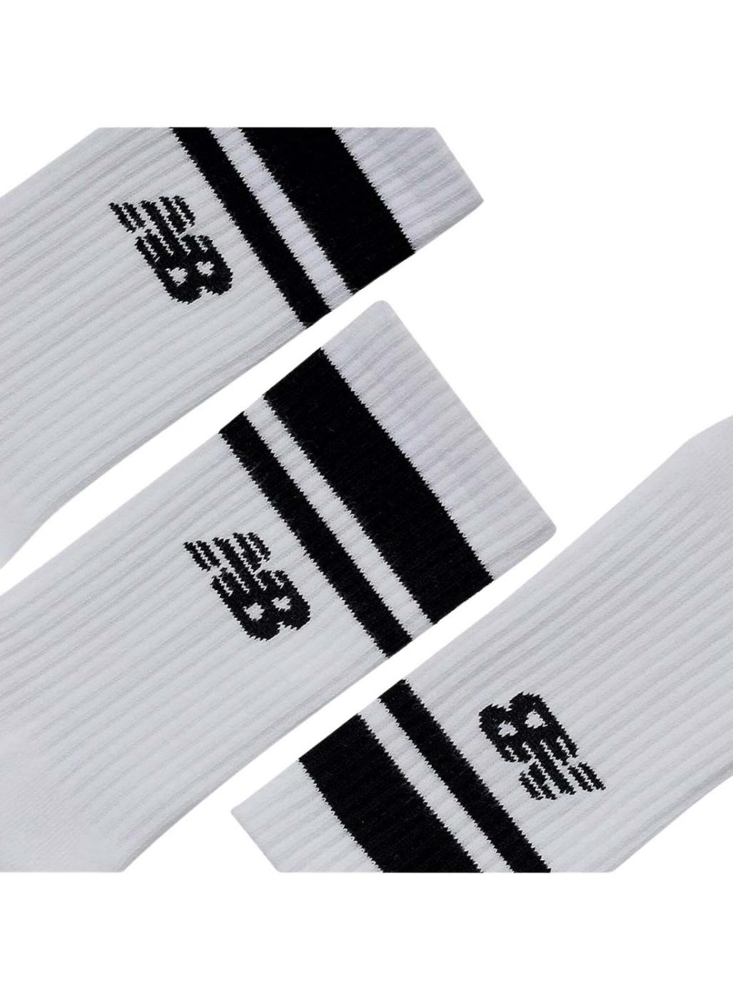Pacote de 3 meias New Balance. Para homens e mulheres. Cor branca. Detalhe de listras e logotipo da New Balance em preto. Feito com uma mistura de algodão respirável. Comprimento médio.