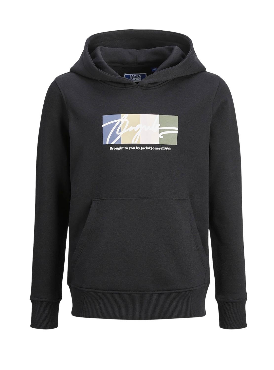 Camiseta Jack and Jones. Cor preta. Com capuz. Design colorblock no logotipo do peito. Mangas compridas. Bainha e punhos elásticos. Corte regular.