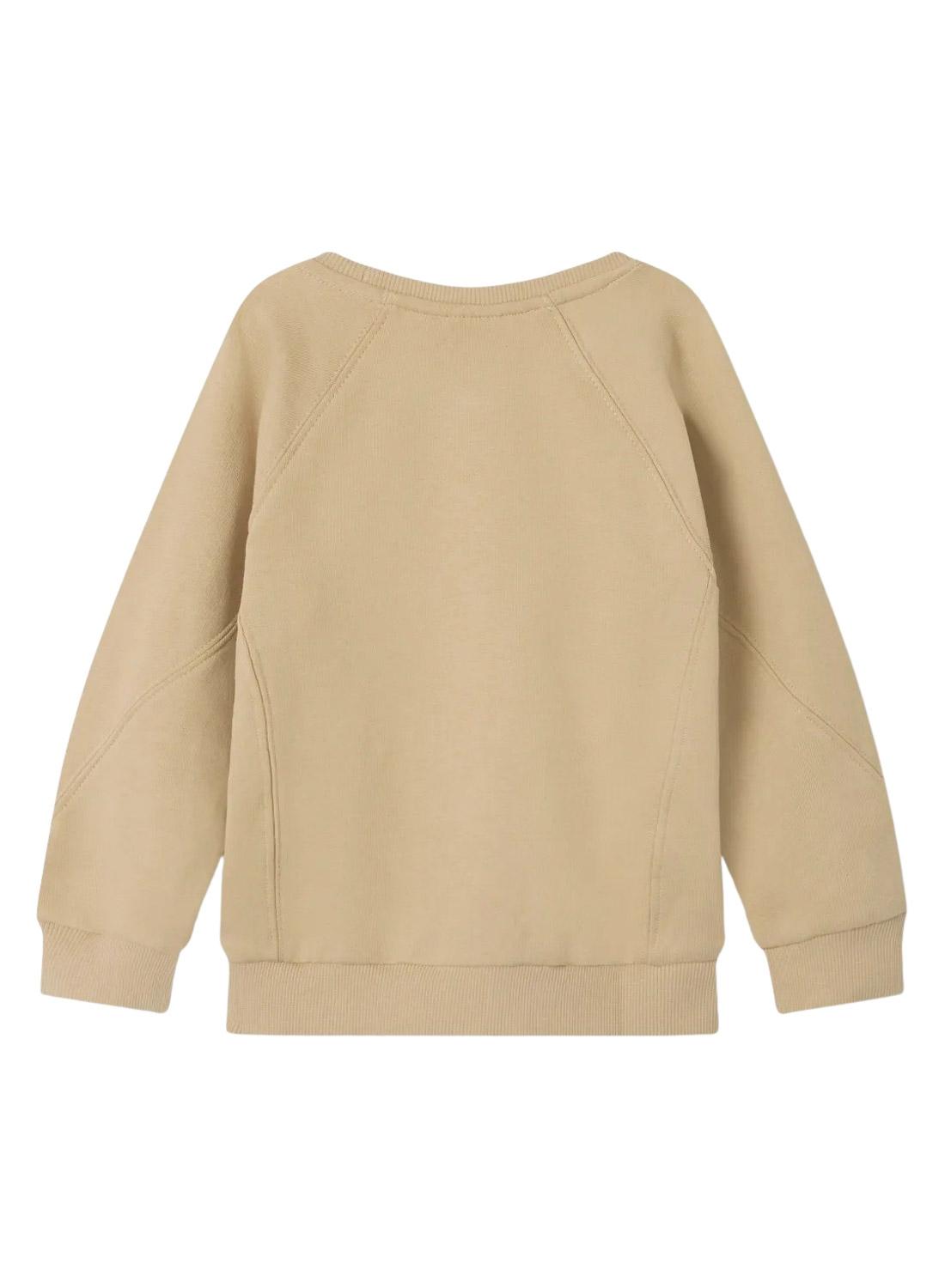 Moletom Name It. Modelo Obanno. Cor bege. Gola redonda. Manga comprida. Sem capuz. Estampa no peito. Cintura e punhos elásticos. Ajuste folgado.
