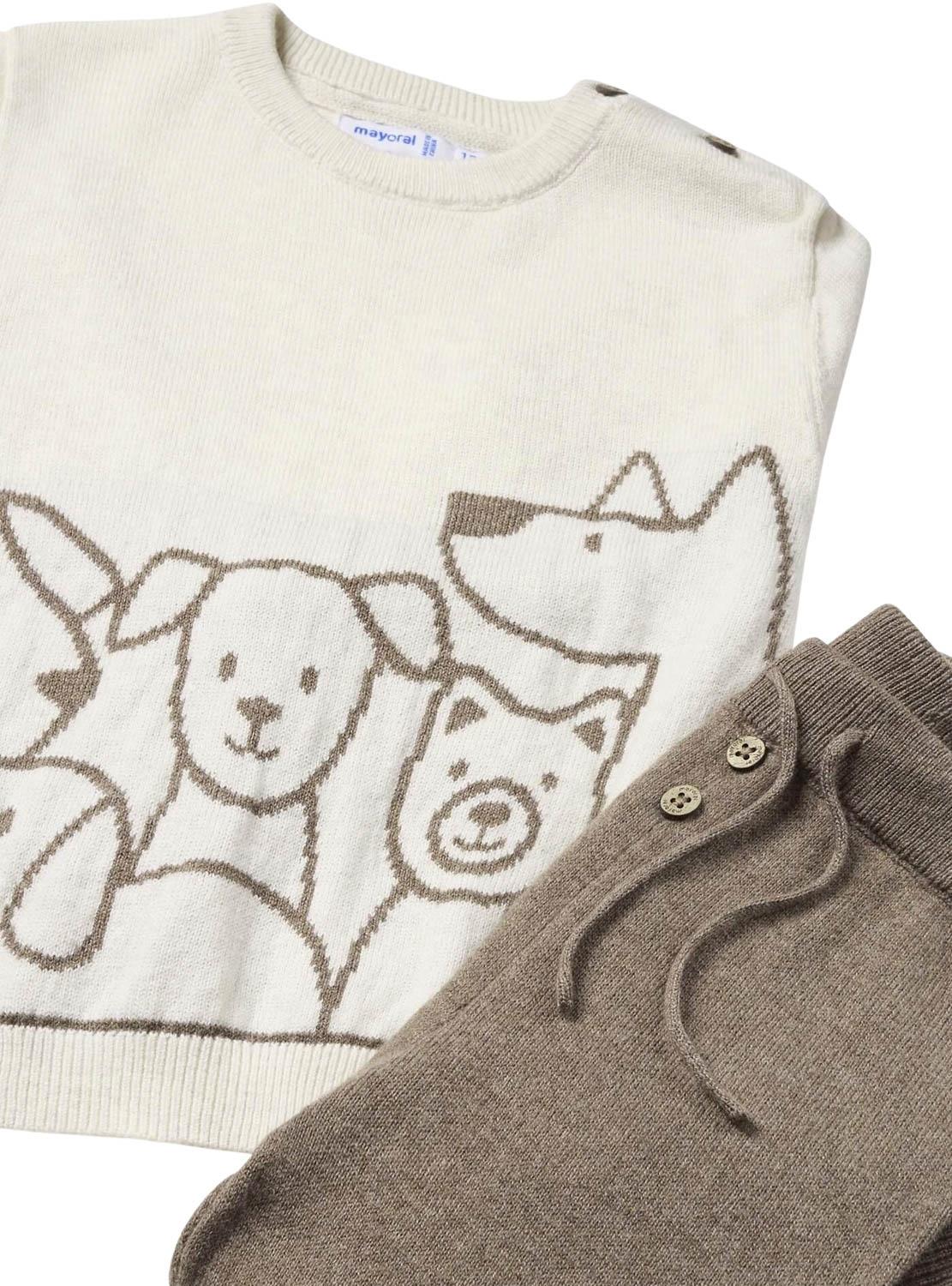 Conjunto Mayoral. Blusa de moletom bordada. Design de animais. Gola redonda. Botões no ombro. Punhos e barra canelados e elásticos. Calças elásticas. Com cordão. Touca com orelhas e motivo de urso.