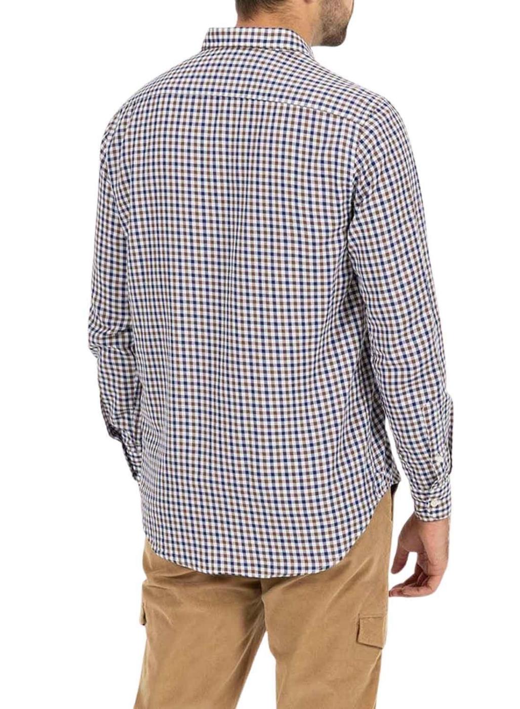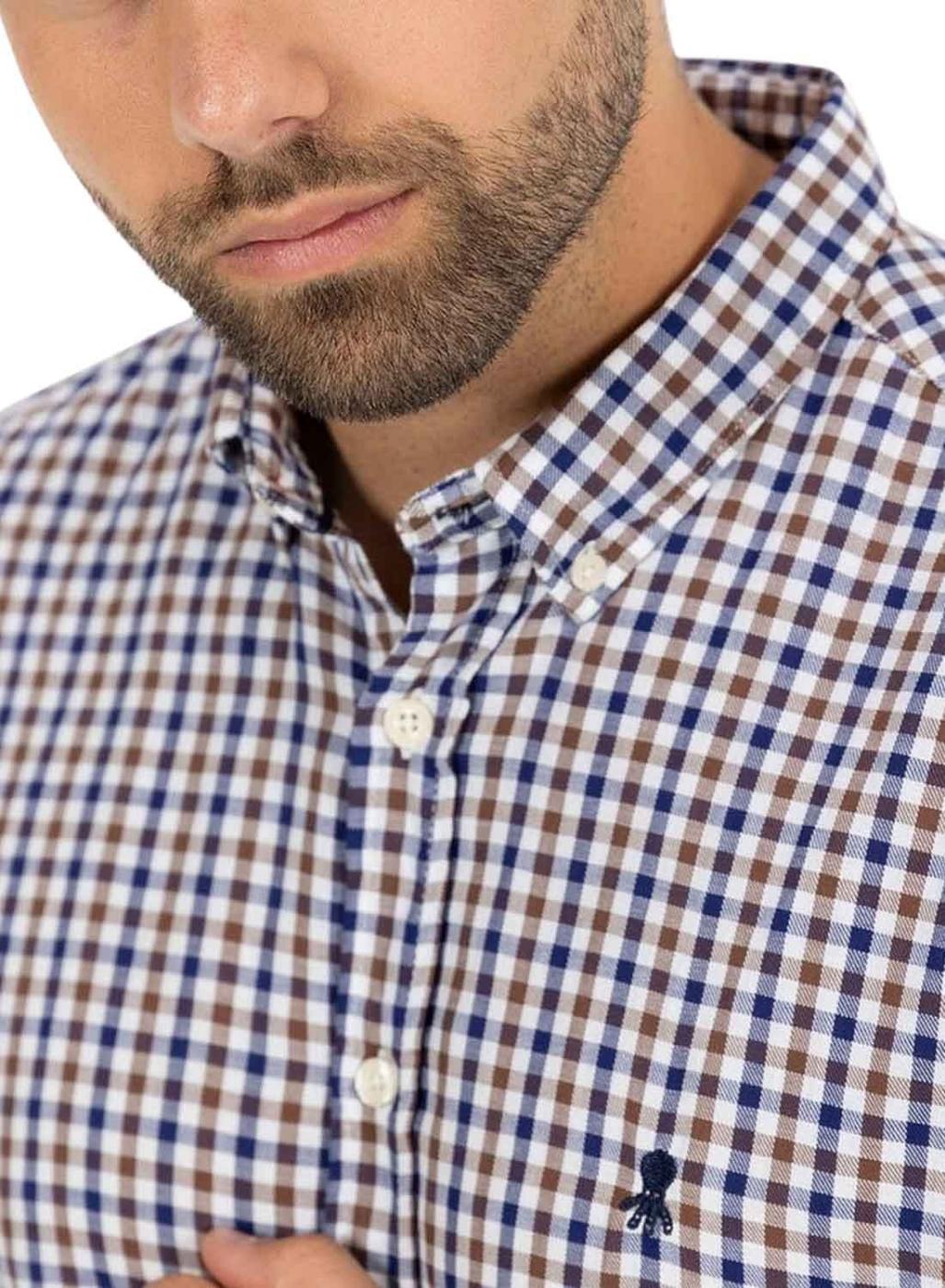 Camisa El Pulpo. Estampa de xadrez vichy em azul marinho e marrom. Fechamento frontal com botões. Logotipo bordado no peito. Colarinho com botões. Manga comprida com punho abotoado. Formato levemente ajustado. Barra arredondada. Parte traseira ligeiramente mais comprida.