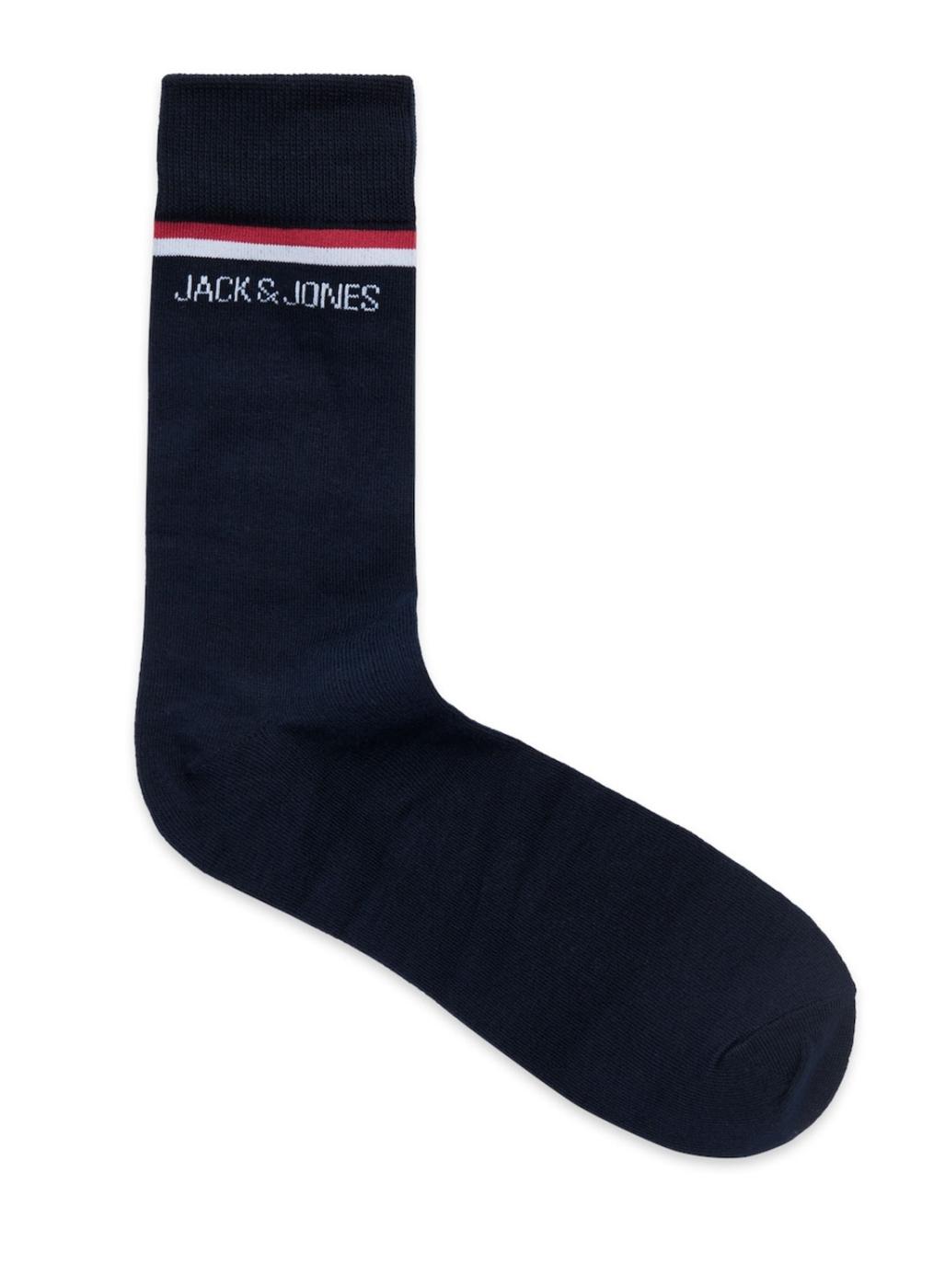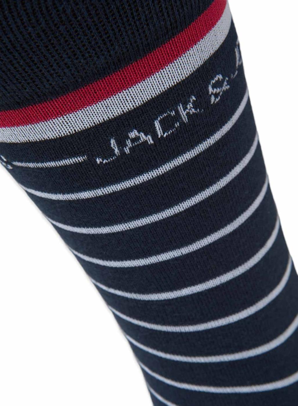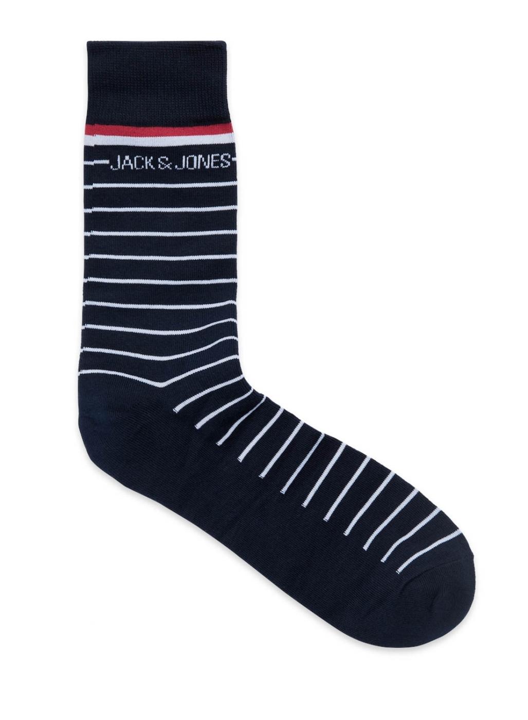 Caixa de três meias Jack and Jones. Cor marinho. Um par liso. Um par com estampa de riscas. Um par com estampa de listras. Detalhe de riscas em azul e branco. Tornozelo canelado. Logotipo da marca estampado. Ideal para presentear.