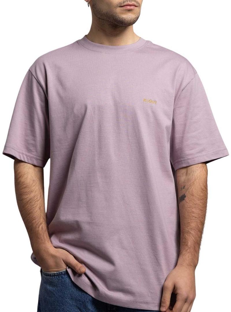 Camiseta Klout. Cor malva. Tecido suave. Gola redonda. Manga curta. Ombros caídos. Corte folgado. Klout bordado no peito. O modelo veste o tamanho M.