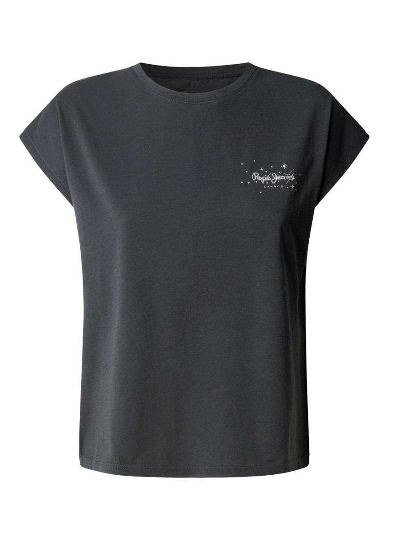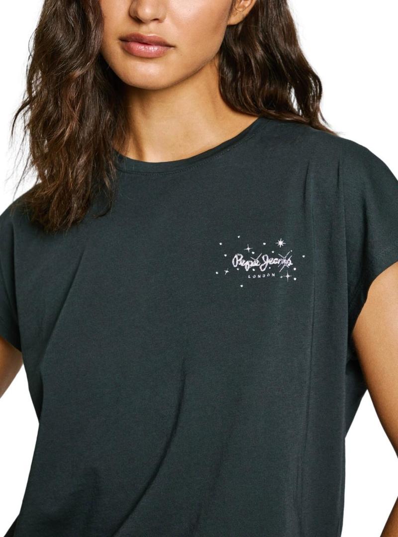 Camiseta Pepe Jeans. Cor preta. Formato folgado. Gola redonda canelada. Manga curta. Pepe Jeans com detalhes de pedraria no peito. Barra com costura dupla. A modelo está vestindo o tamanho S.