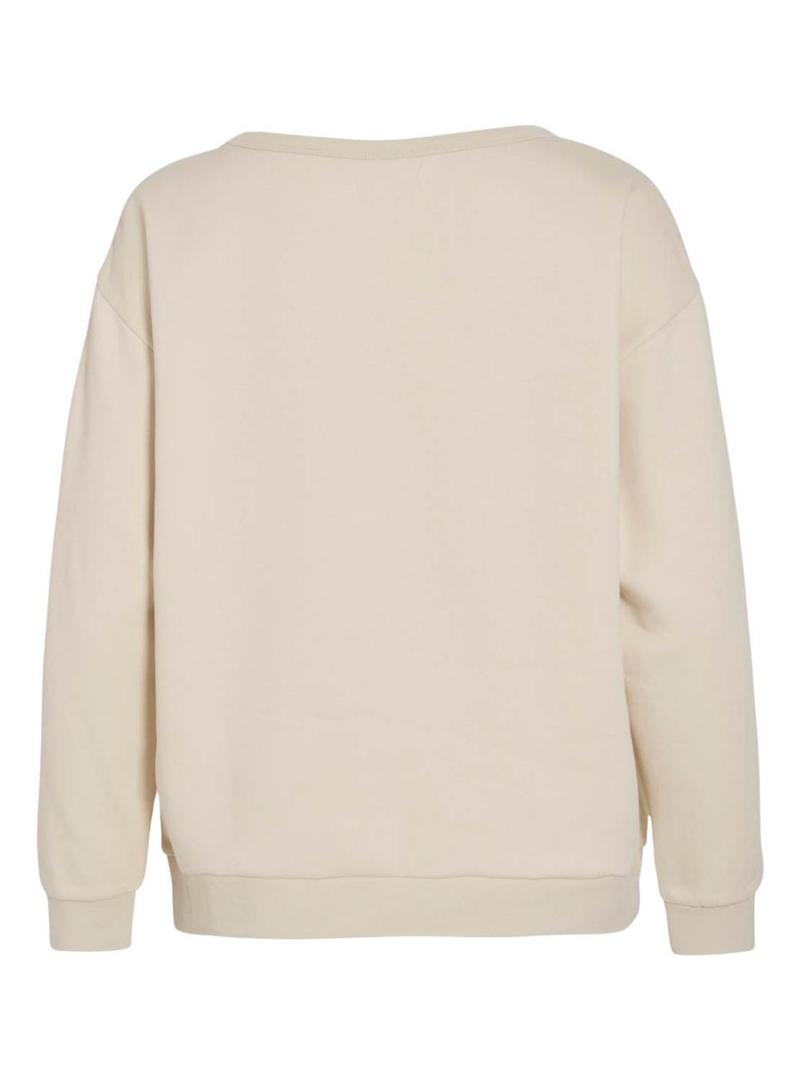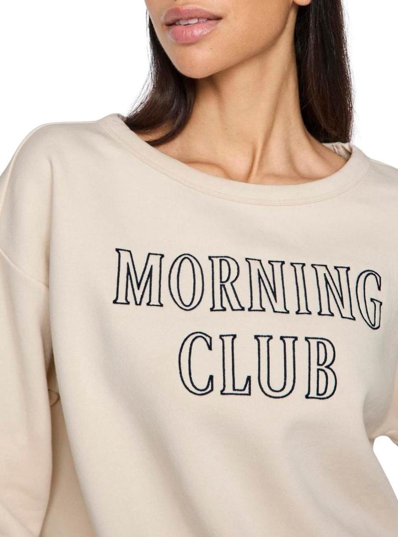 Moletom Vila. Modelo Vimaldea. Cor bege. Gola redonda. Extremidades elásticas. Ajuste folgado. Homem caído. Mensagem estampada no peito.