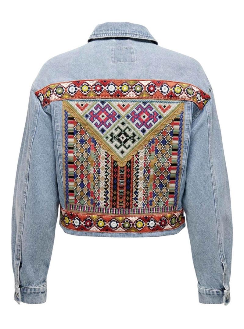Jaqueta Jeans Only. Formato curto. Manga comprida. Frente com botões. Bolsos com lapela no peito. Bordados étnicos na parte de trás. Tecido lavado. A modelo veste o tamanho S.