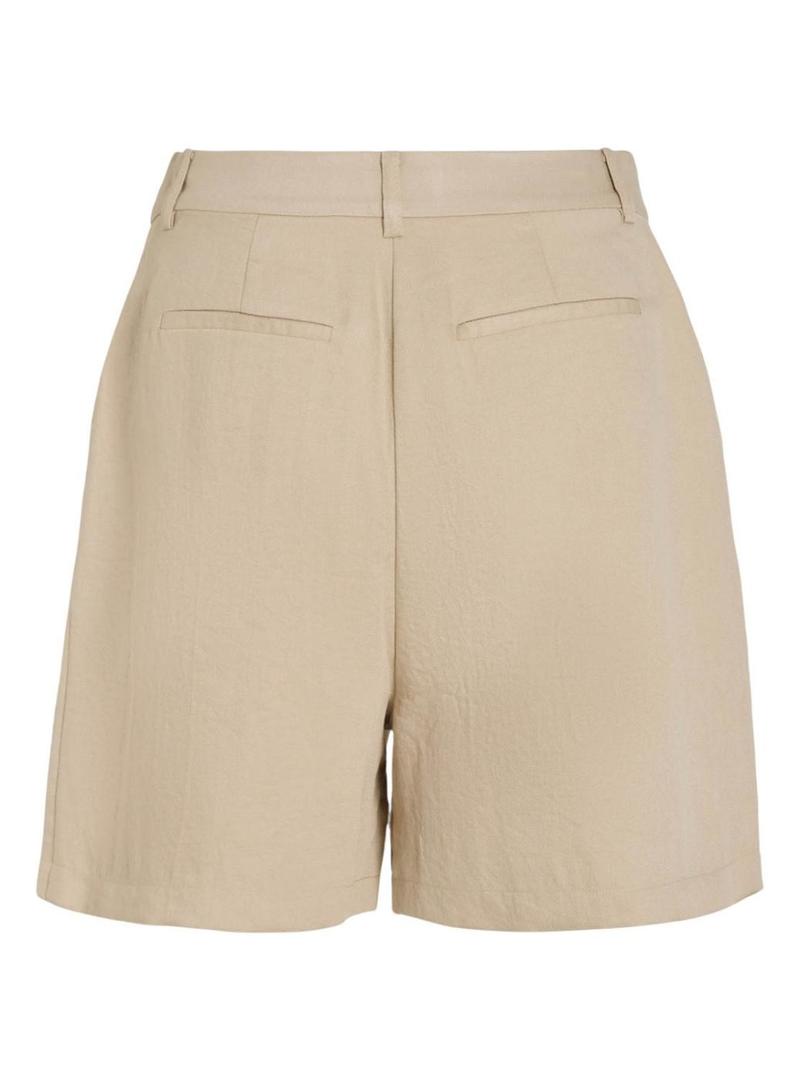 Shorts Vila. Cor bege. Cintura alta. Detalhe de pregas. Bolsos laterais. Bolsos traseiros com debrum. Tecido suave. A modelo veste o tamanho 36.