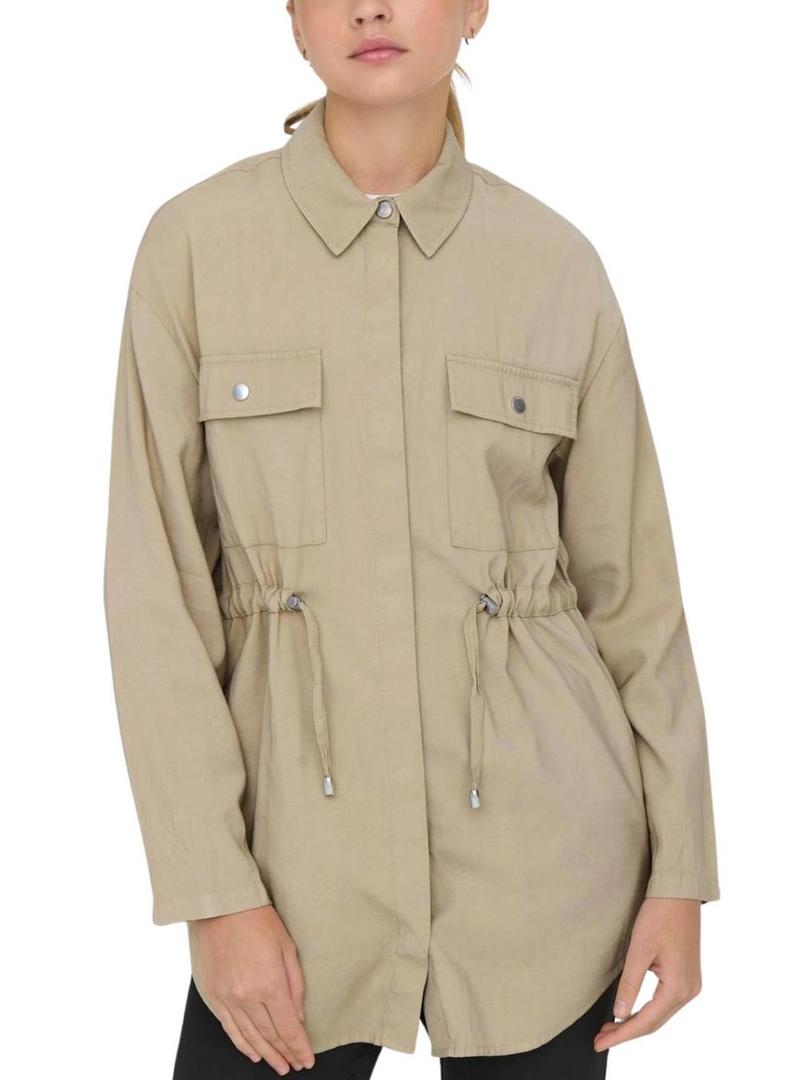 Casaco Only. Cor bege. Tecido leve. Gola italiana. Bolsos no peito com aba. Cintura ajustável com cordões. Bainha arredondada. Manga comprida. Fecho com botões. Corte regular. O modelo veste o tamanho S.