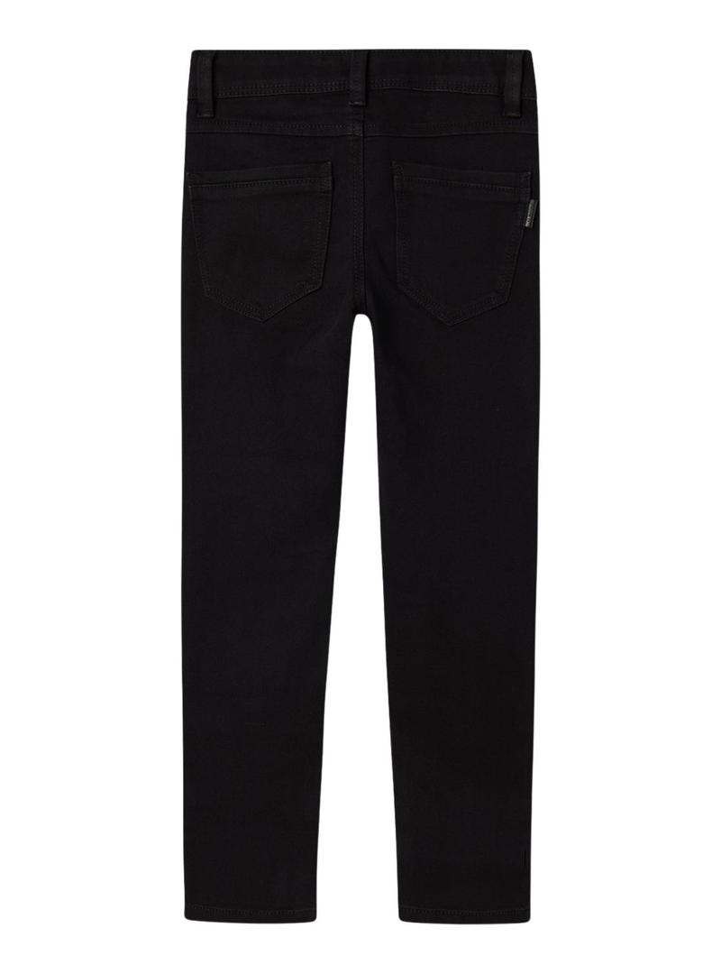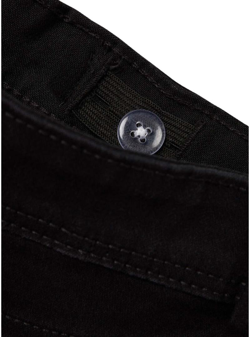Calça Name It. Modelo Silas. Cor preta. Corte skinny. Cinco bolsos. Fecho de botão e zíper. Cintura ajustável no interior com banda elástica.