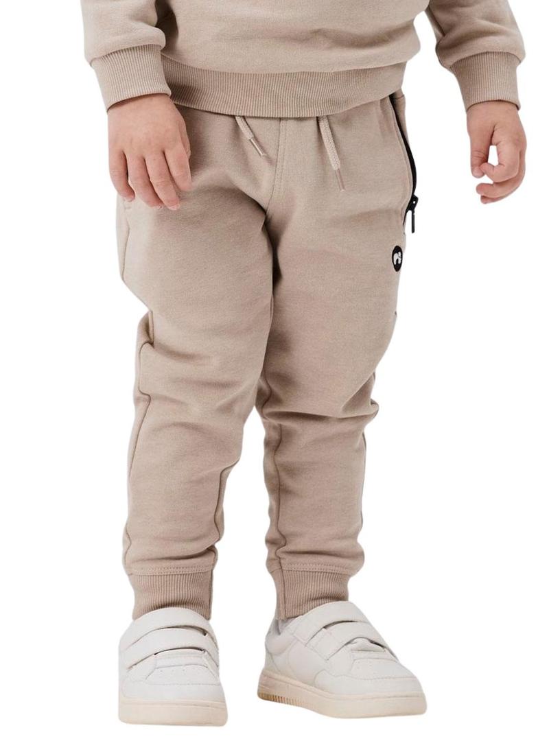 Calça Name It. Modelo Vimo. Cor bege. Bolsos laterais com zíper. Cintura elástica com cordão. Barra com punho. Logo circular. Estilo jogger. Para crianças pequenas.