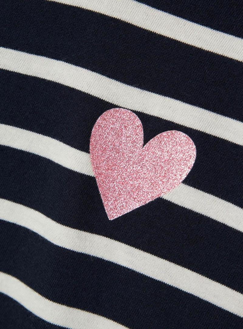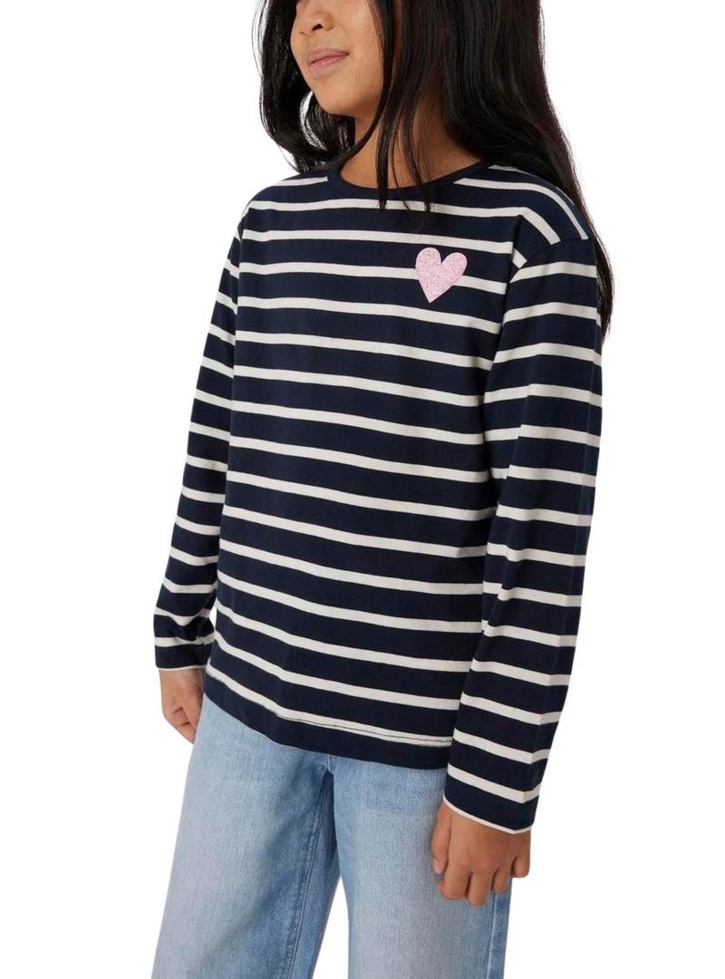 Camiseta Name It. Modelo Tovelina. Cor azul marinho e branco. Estampa listrada. Gola redonda. Manga longa. Ajuste regular. Coração estampado no peito em cor rosa.
