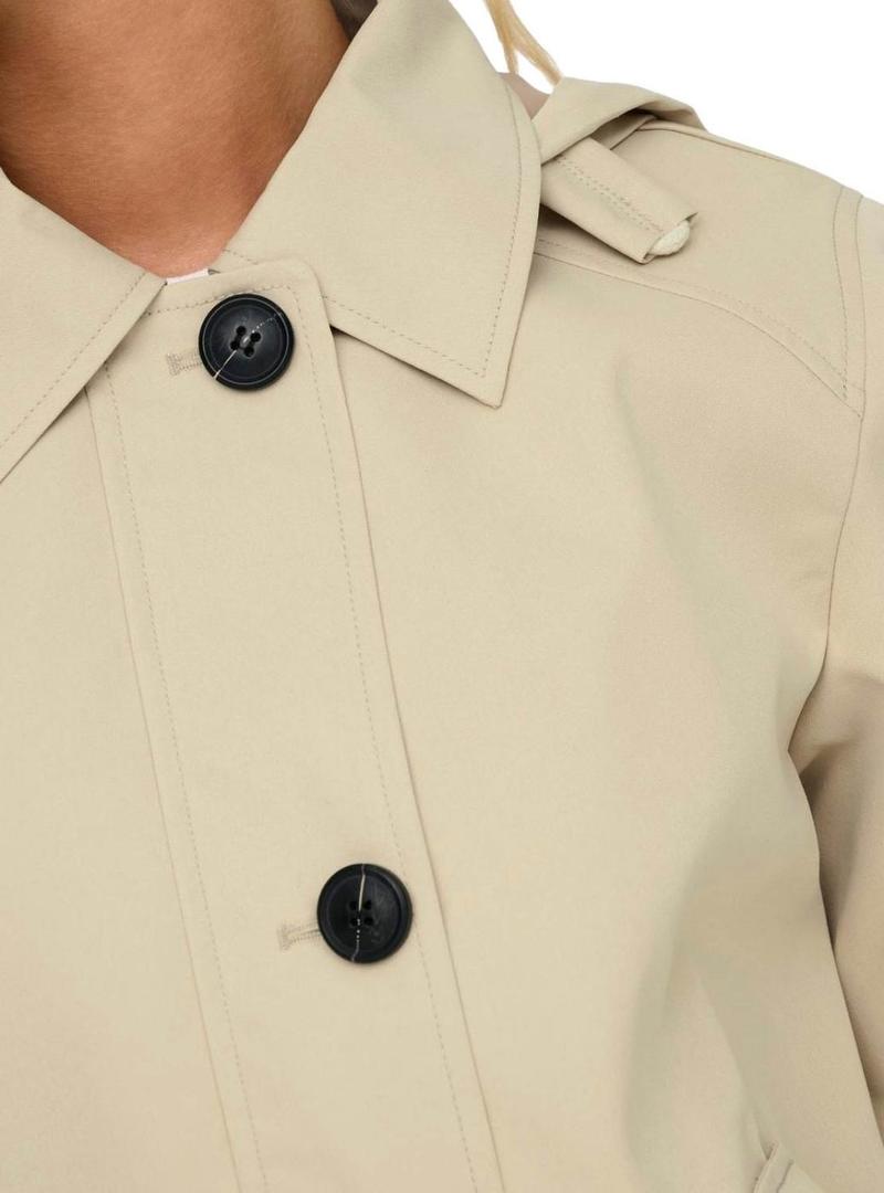 Parca Apenas. Modelo Norma. Cor beige. Capuz removível. Gola camiseira. Fechamento com botões. Bolsos laterais. Ajuste folgado. Barra com cordão.