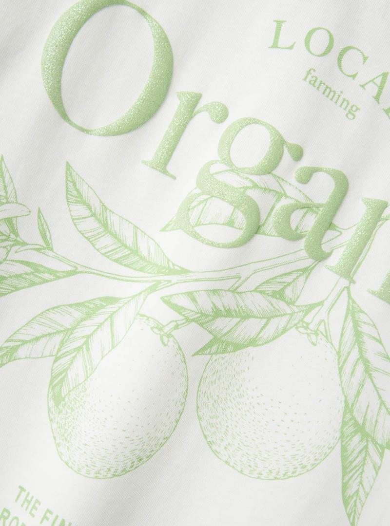 Camiseta Name It. Modelo Boway. Cor branca. Gola redonda. Manga curta. Ajuste quadrado. Mensagem estampada no peito. Ilustração nas costas. Cor verde.