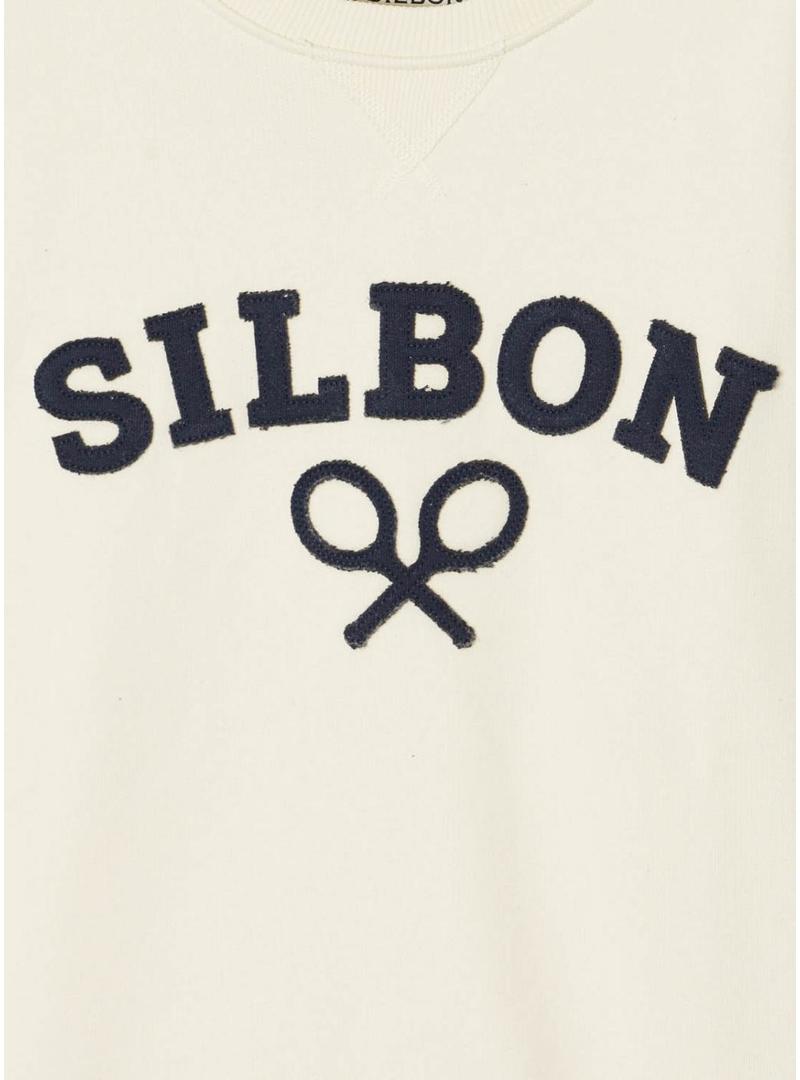 Moletom Silbon. Modelo Raquete. Cor bege. Gola redonda. Extremidades caneladas. Logotipo bordado em tecido azul-marinho no peito. Ajuste regular.