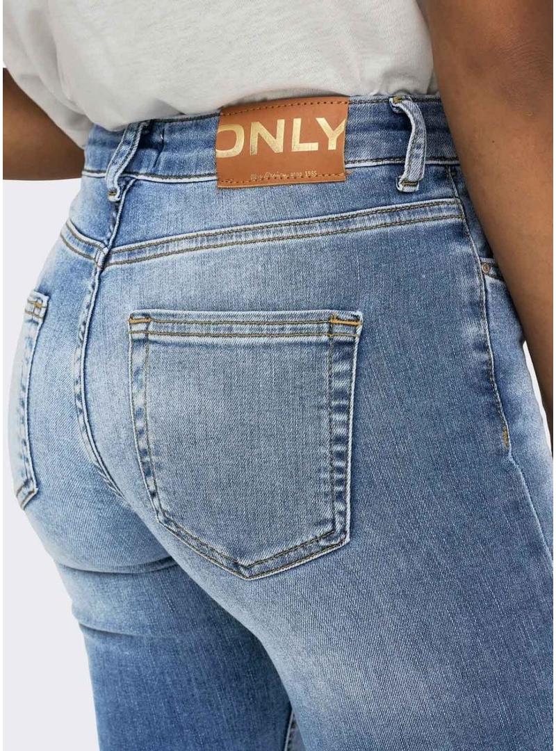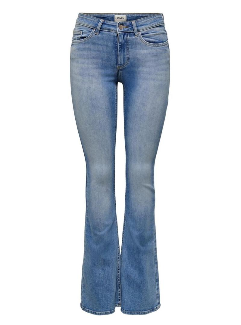 Calça jeans. Modelo Blush. Cor azul. Passadores para cinto. Fecho de botão e zíper. Corte flare.