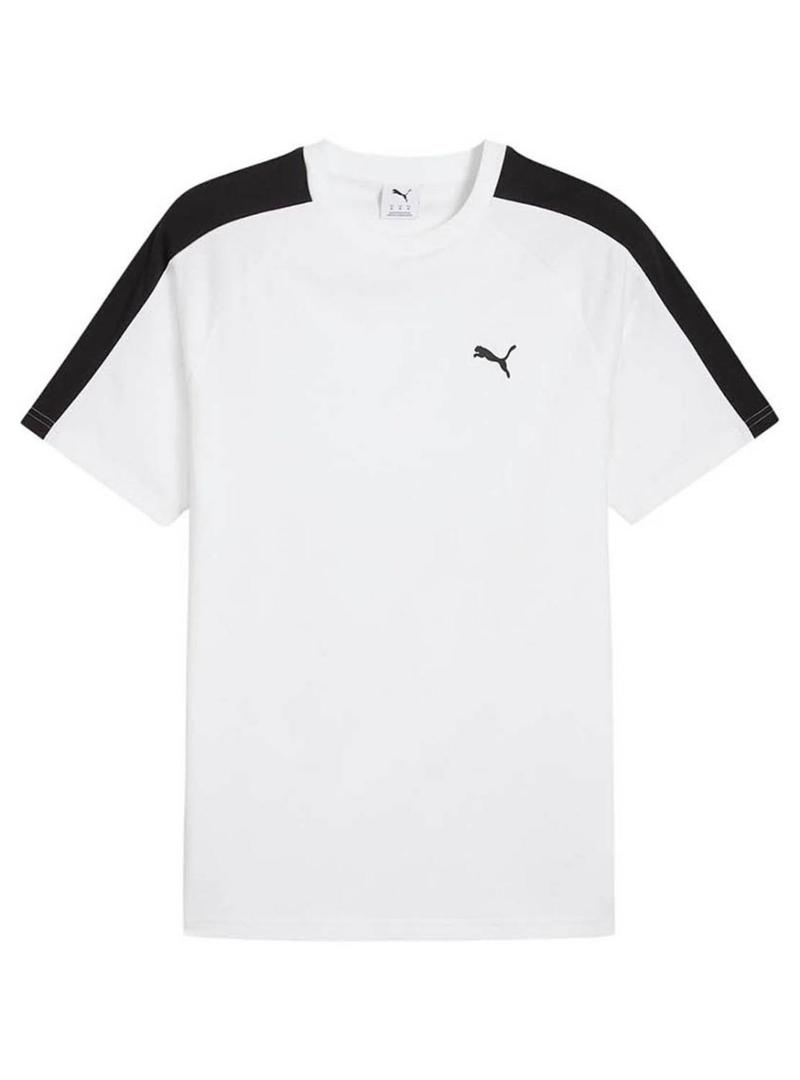 Camiseta Puma. Modelo T7. Cor branca. Gola redonda. Ajuste regular. Manga curta. Faixas pretas no ombro e mangas. Logo estampado no peito.