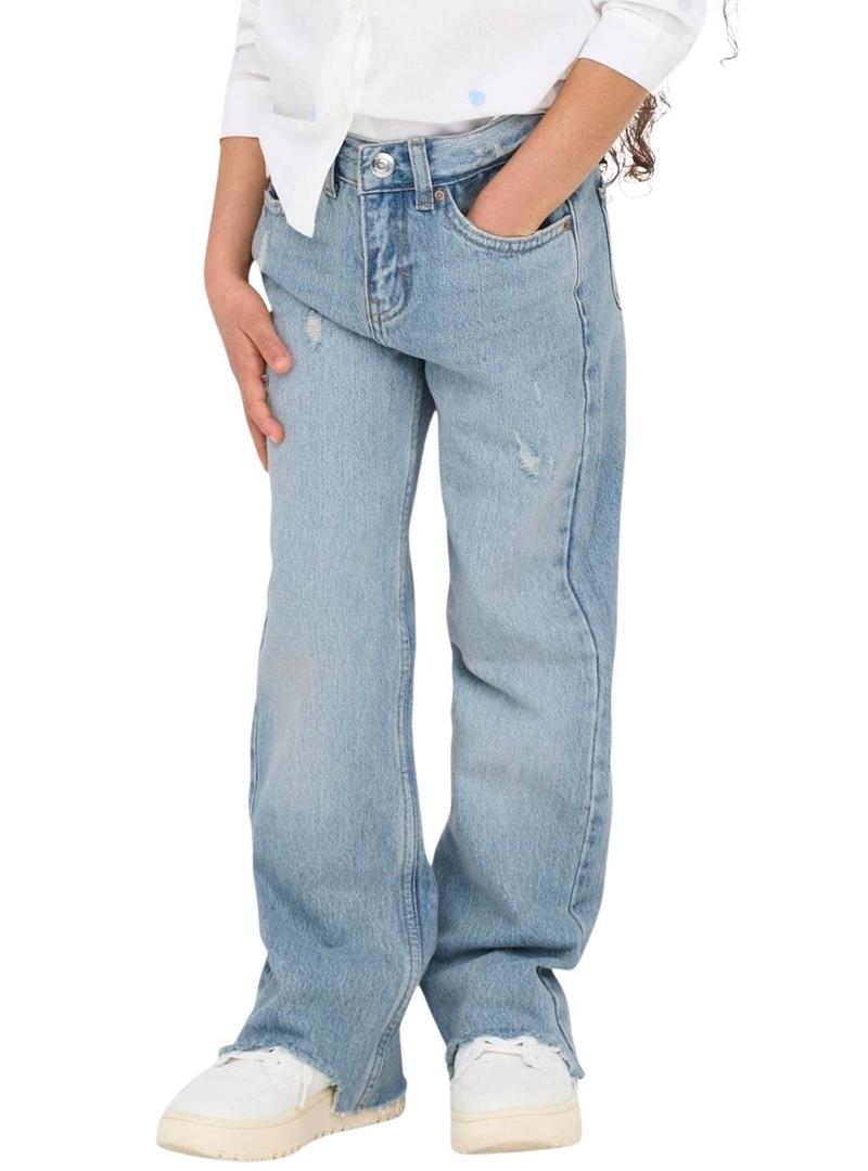 Calça jeans Only Kids. Modelo Juicy. Cor denim claro. Corte reto. Efeito desgastado. Cinco bolsos. Cintura ajustável por dentro.
