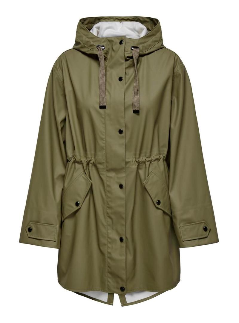 Casaco impermeável Only. Modelo New Station. Cor verde. Capuz ajustável com cordão. Fecho de botões. Bolsos laterais. Tecido impermeável.