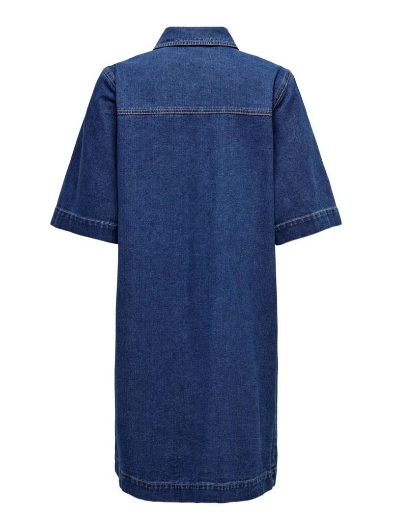 Vestido Only. Modelo Belle. Cor azul marinho. Fechamento com botões. 2 bolsos frontais. Mangas 2/4. Gola de camisa. Corte regular.