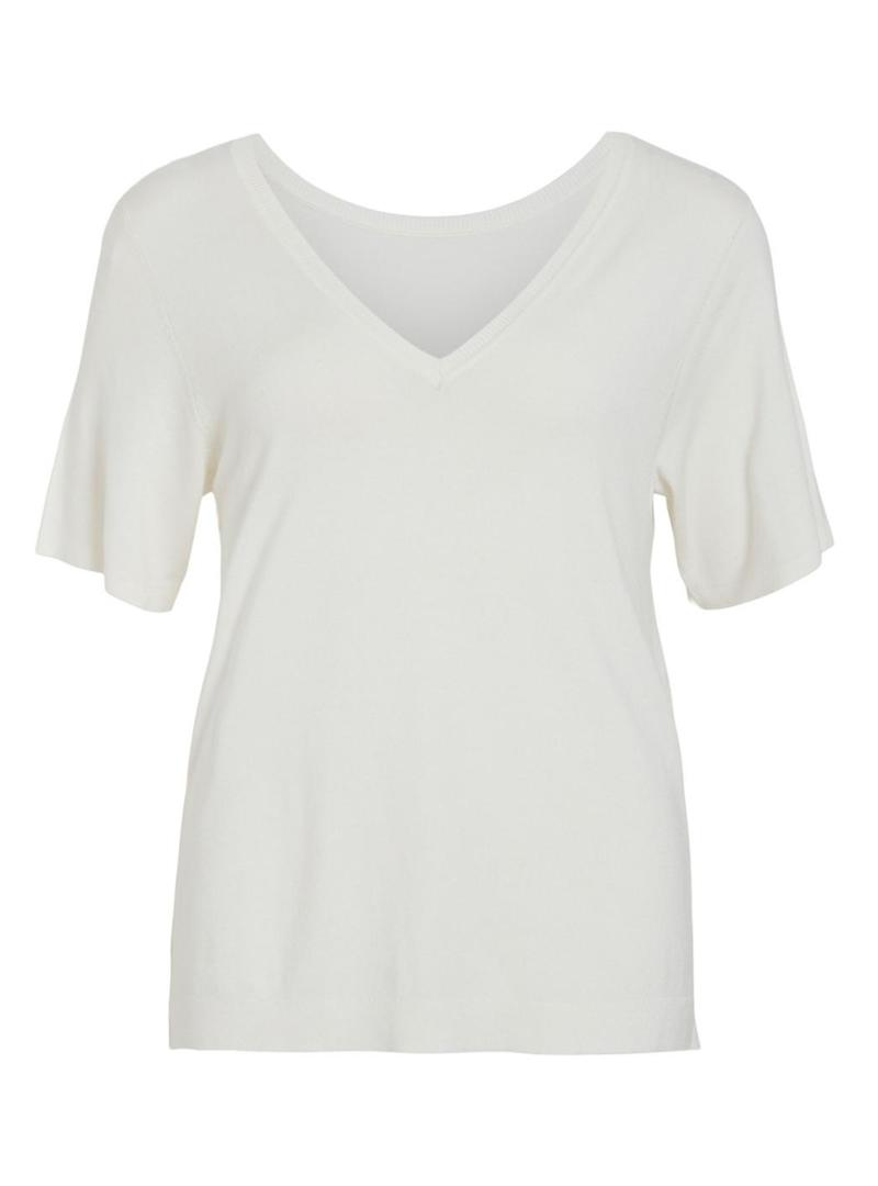 Camiseta Vila. Modelo Wennie. Cor branca. Manga curta. Decote em V. Acabamentos canelados. Corte regular.