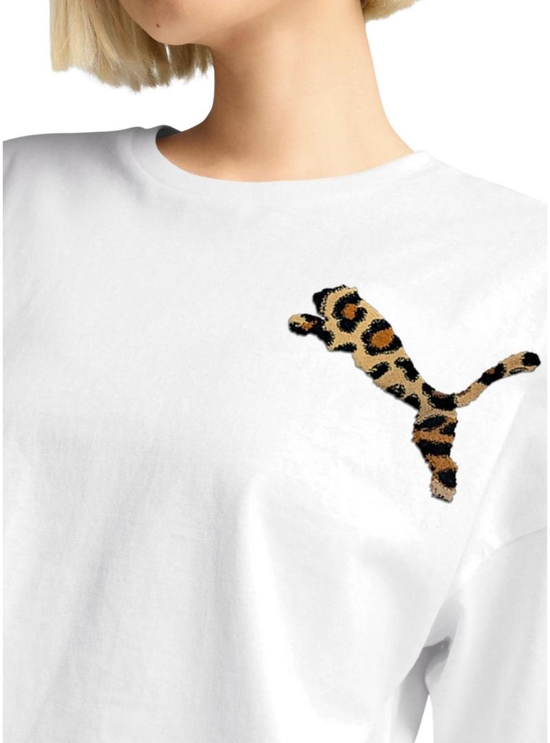 Camiseta Puma. Modelo Leo Luxe. Cor branca. Logotipo da marca no peito. Corte oversize.