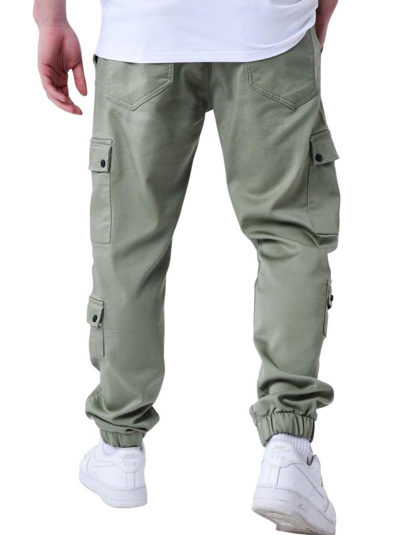 Calças Project X Paris. Estilo cargo. Cor verde. Cintura elástica com cordão. Vários bolsos laterais e 2 bolsos na parte de trás. Barra elástica.