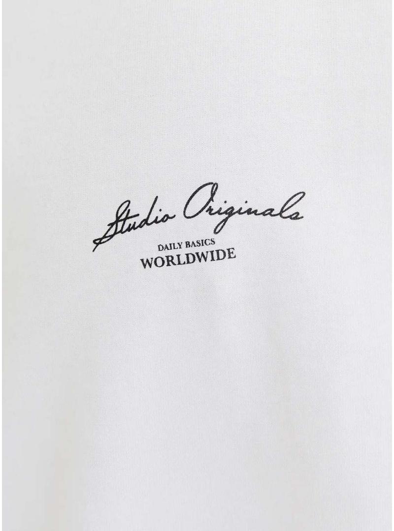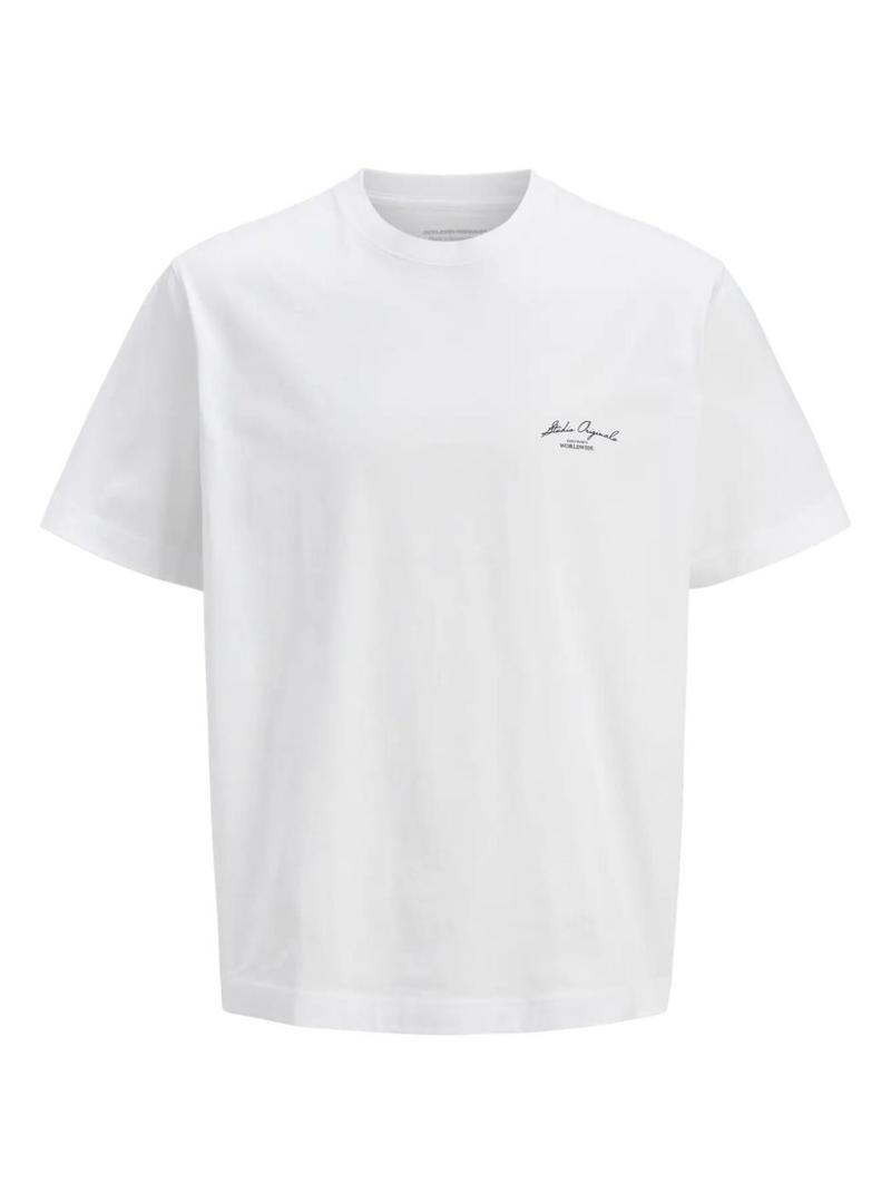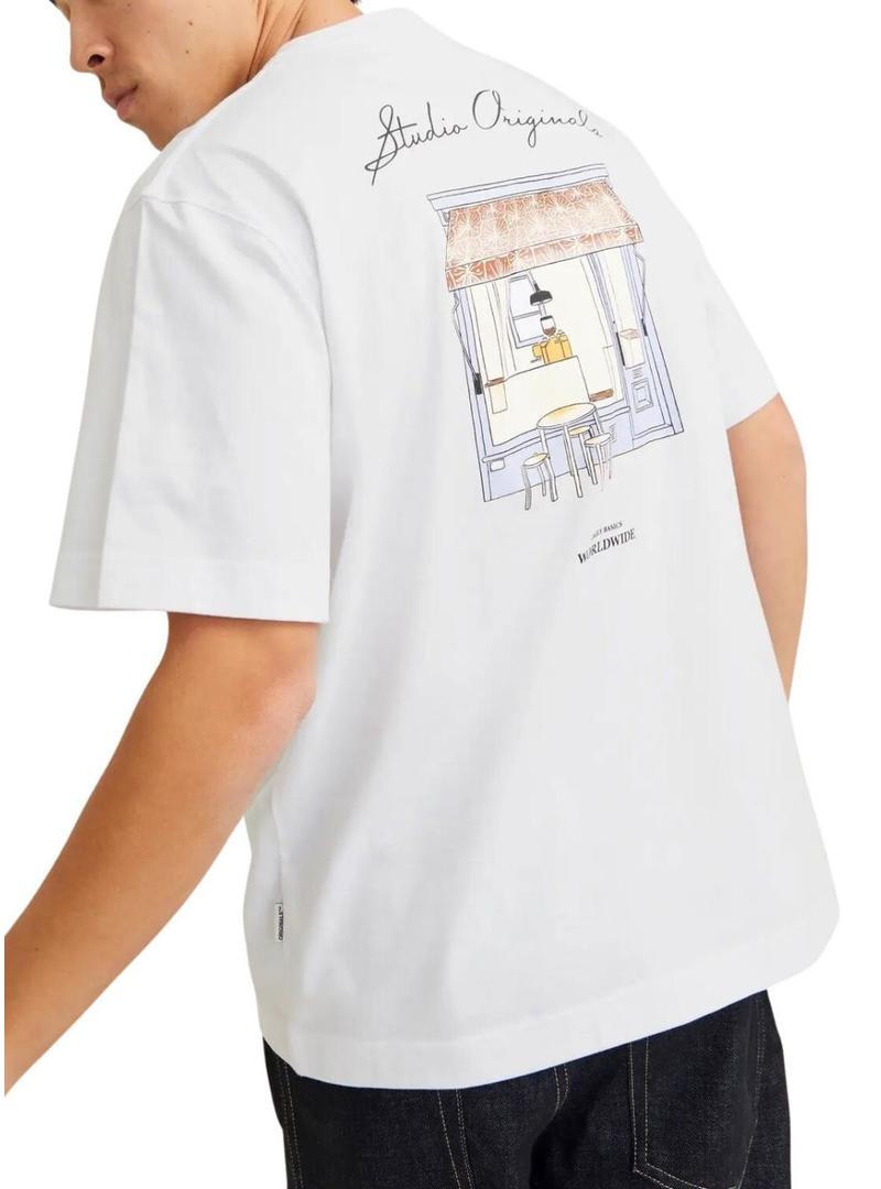 Camiseta Jack and Jones. Modelo Islington. Cor branca. Manga curta. Gola redonda. Logótipo no peito. Estampado nas costas. Corte largo.