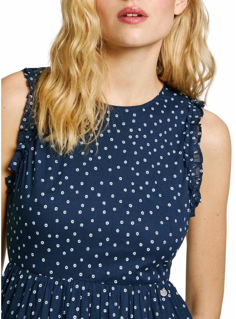 Vestido Pepe Jeans. Modelo Deborah. Cor azul marinho. Gola redonda. Sem mangas. Fechamento com laço atrás. Decote nas costas. Saia com leve rodado. Estampado com bolinhas. Ajustado até a cintura. Corte midi.