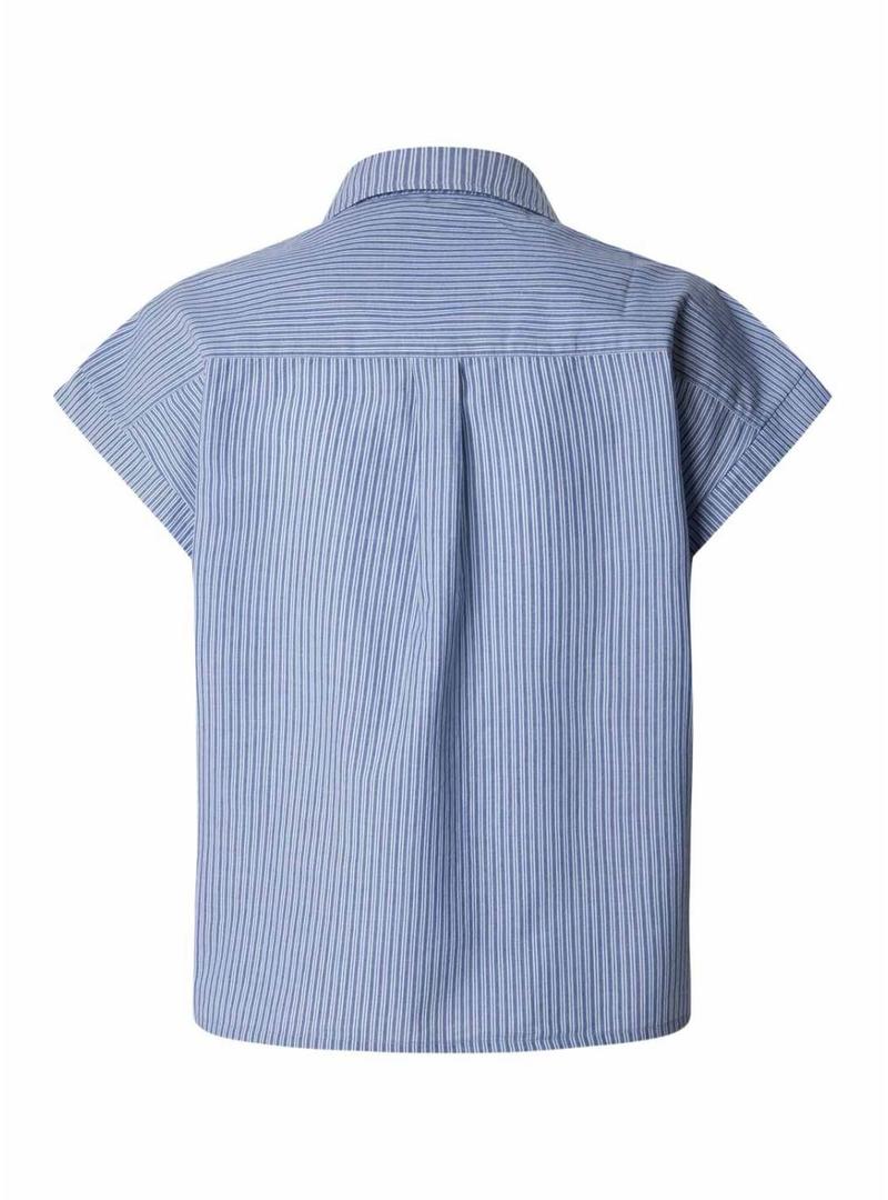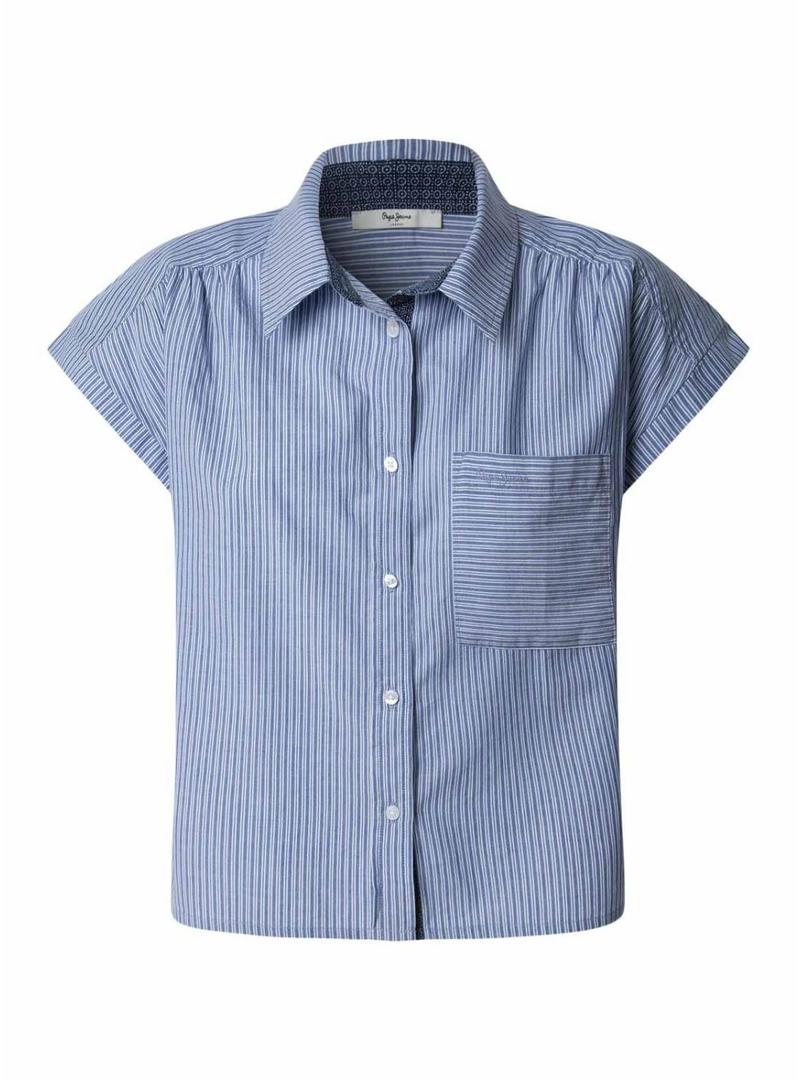 Camisa Pepe Jeans. Modelo Dixit. Cor azul. Estampado com micro listras verticais. Bolso de remendo no peito na diagonal. Manga curta. Ajuste reto. Fechamento com botões.