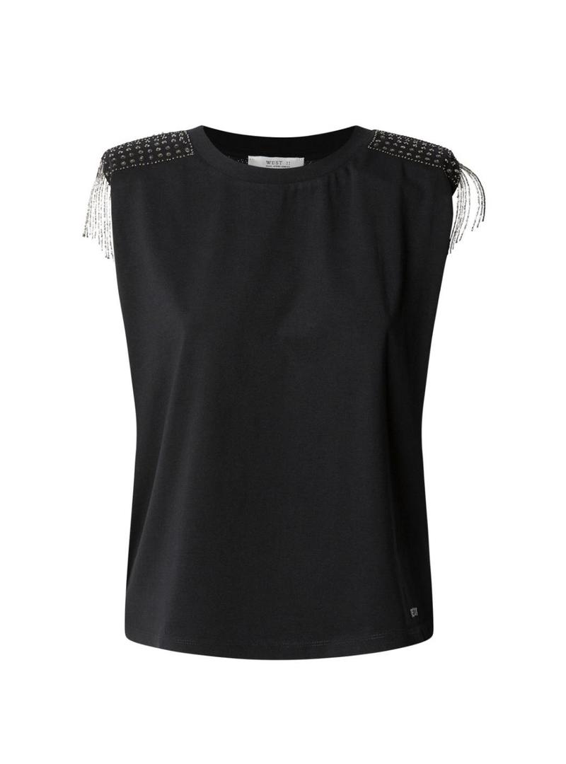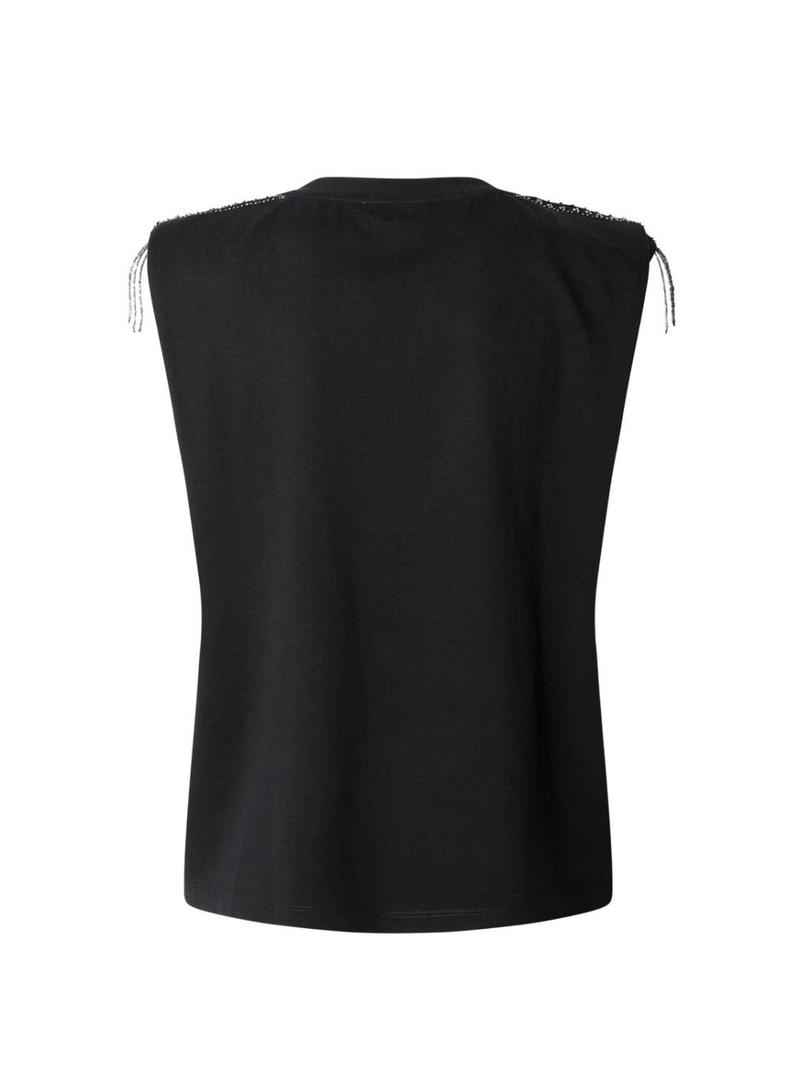 Camiseta Pepe Jeans. Modelo Vatiana. Cor preta. Sem mangas. Gola redonda. Logotipo bordado na parte inferior. Ombros com strass prateado e franjas.