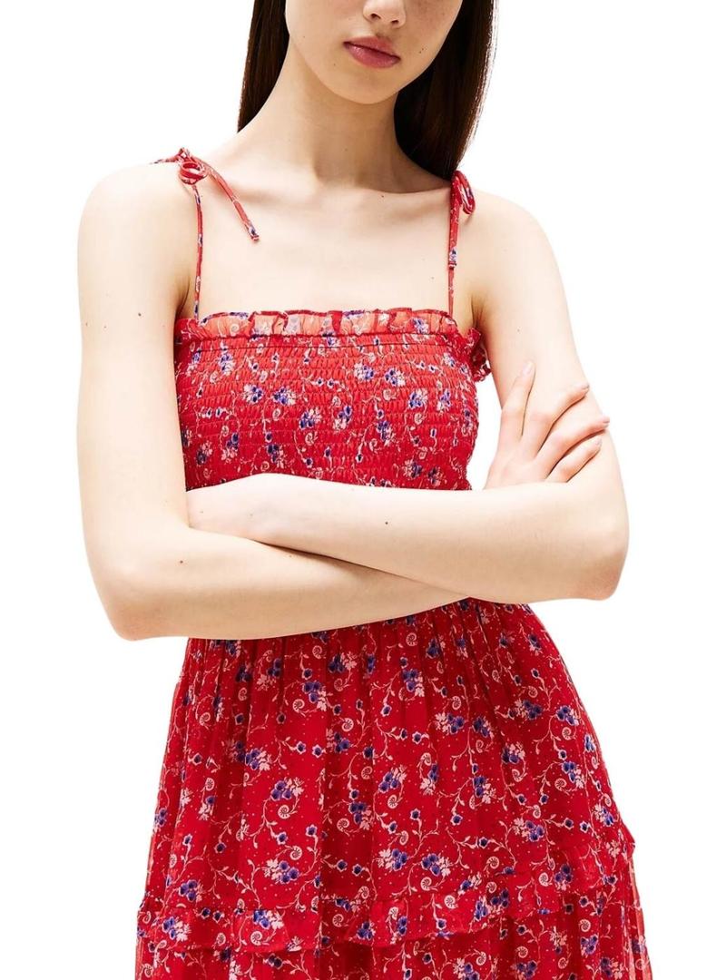Vestido Tommy Jeans. Modelo Chiffon. Cor vermelha. Decote reto. Alças ajustáveis com laço. Estampa de flores. Parte superior franzida e elástica estilo favo de mel. Saia com babados discretos. Tecido leve. Com forro. Corte midi.