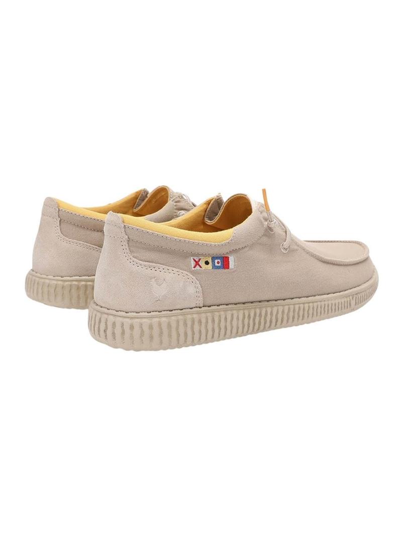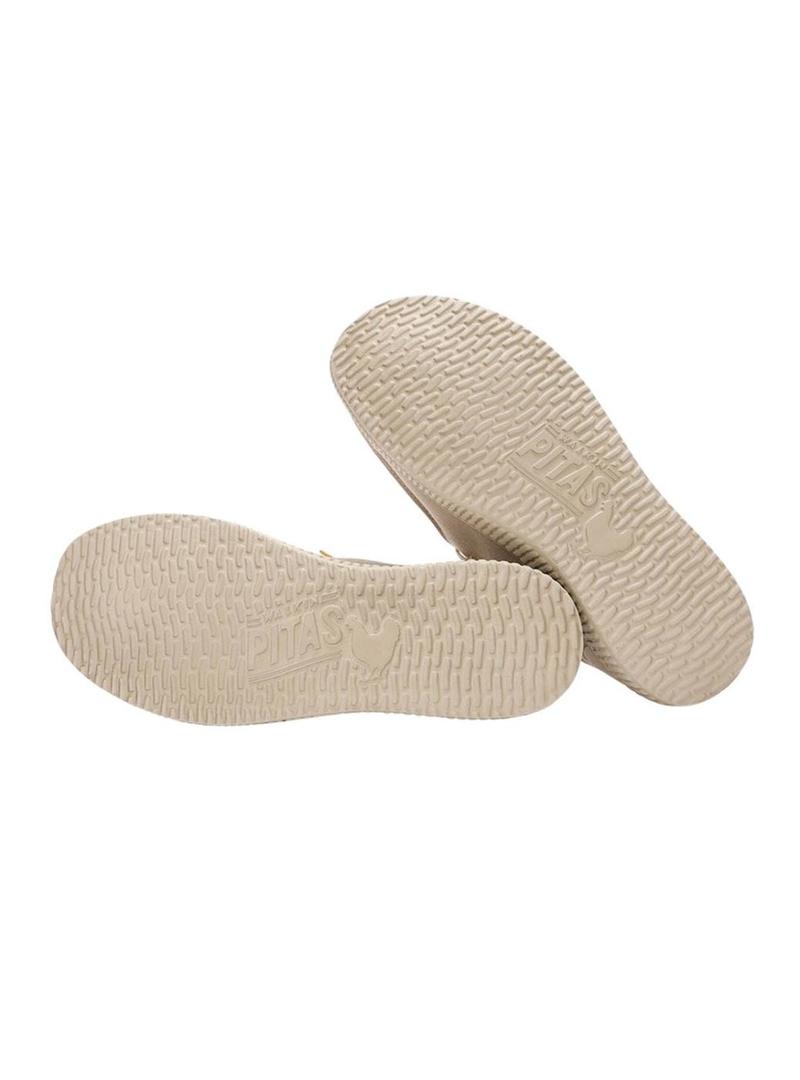 Sapatos Walkin Pitas. Modelo Deck. Cor bege. Cadarços elásticos. Parte superior em algodão respirável. Palmilha de EVA e couro removível. Muito leves, peso de 150 gramas. Sola termosselada de EVA. Bandeiras bordadas. Logo gravado.