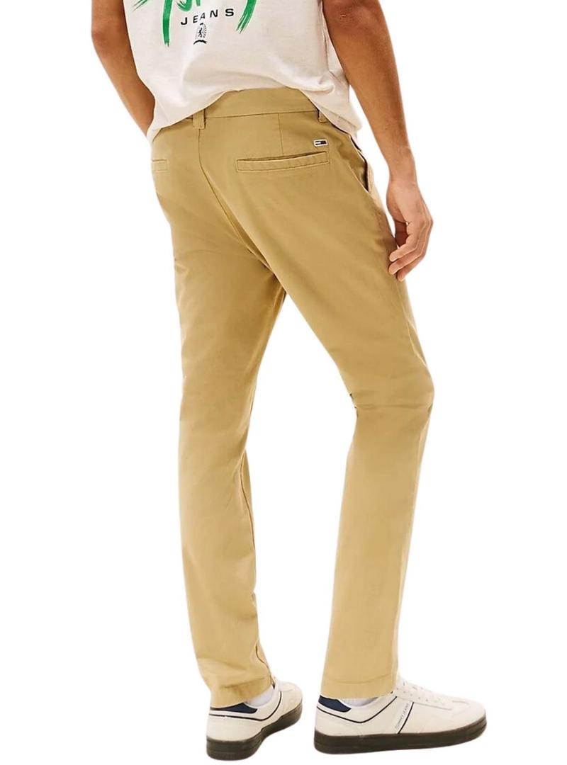Calças Tommy Jeans. Modelo Austin. Estilo chinês. Cor bege. Fecho com botão e zíper. Corte slim. Bolsos laterais. Cintura média. Bolsos traseiros com vivo. Logotipo bordado na parte de trás.