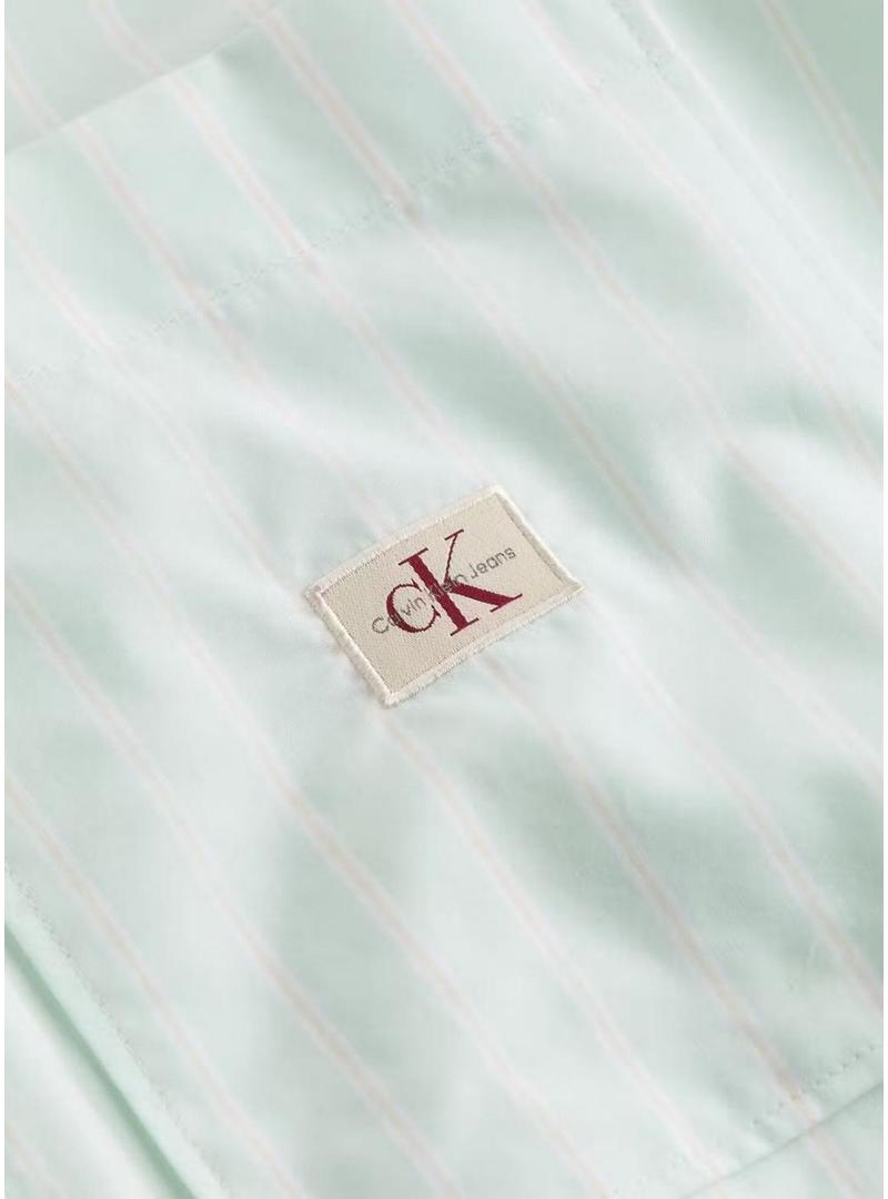 Camisa Calvin Klein Jeans. Modelo Summer Poplin. Cor turquesa. Estampado com listras verticais em branco. Ajuste folgado. Fechamento com botões. Bolso no peito com emblema da marca bordado.