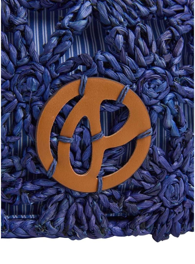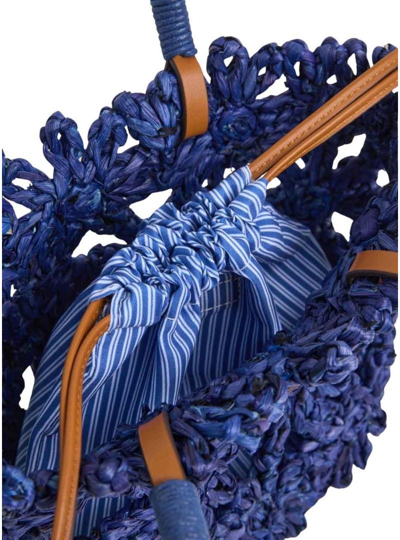 Bolsa Pepe Jeans. Modelo Gina Sunrise. Cor azul. Tecido de ráfia com detalhes bordados em forma de flor. Forro interior de algodão listrado com fecho de cordão. Duas alças curtas em efeito de couro. Remendo de monograma costurado na parte da frente. Etiqueta com logo PEPEJEANS na parte de trás. Dimensões: 22 cm x 11 cm x 20 cm.