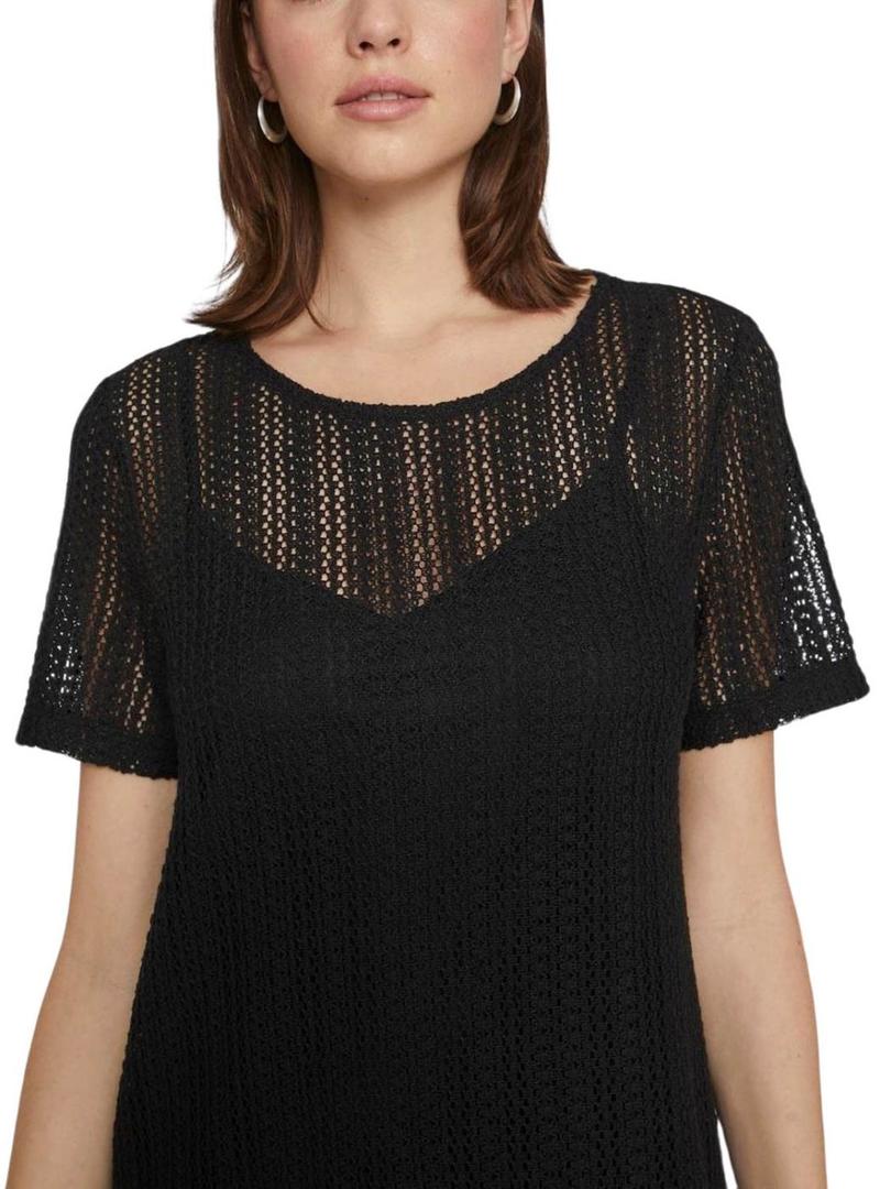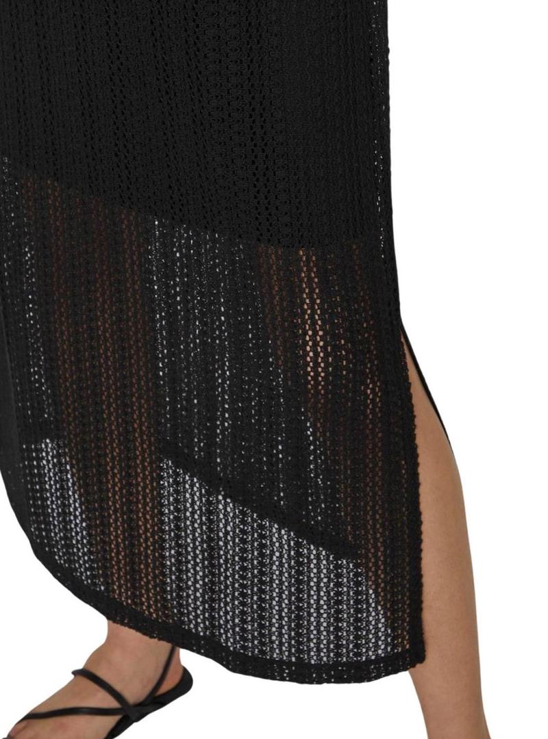 Vestido Vila. Cor preta. Manga curta. Gola redonda. Tecido vazado. Com forro de alças combinando. Abertura lateral. Formato midi. A modelo veste tamanho S.