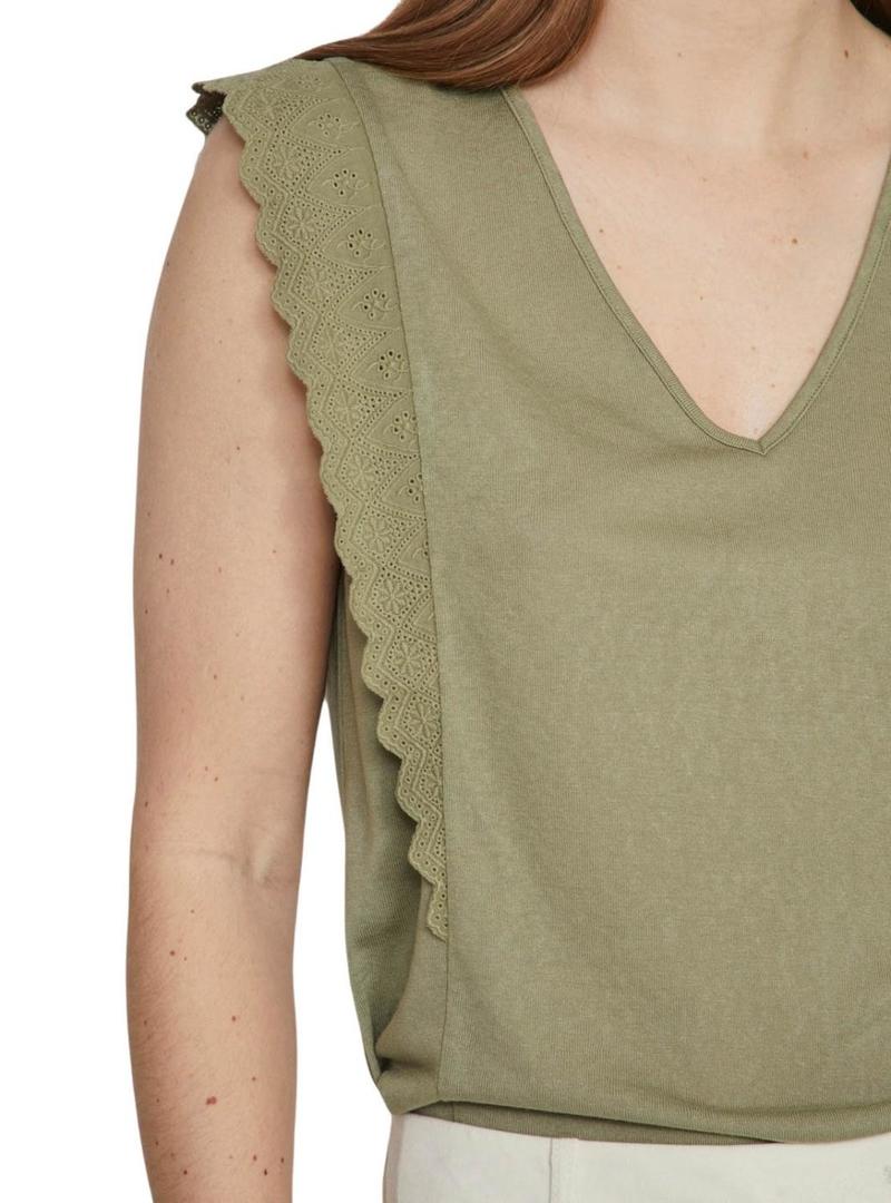 Camiseta Vila. Tecido leve. Cor verde. Sem mangas. Decote em V. Detalhes em renda. Corte reto. O modelo veste tamanho S.