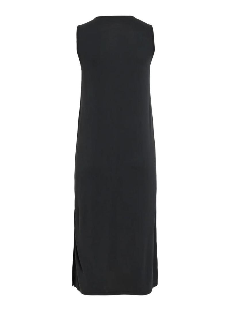 Vestido Vila. Cor preta. Comprimento midi. Sem mangas. Gola redonda. Abertura lateral. Tecido suave. Corte regular. O modelo veste o tamanho S.