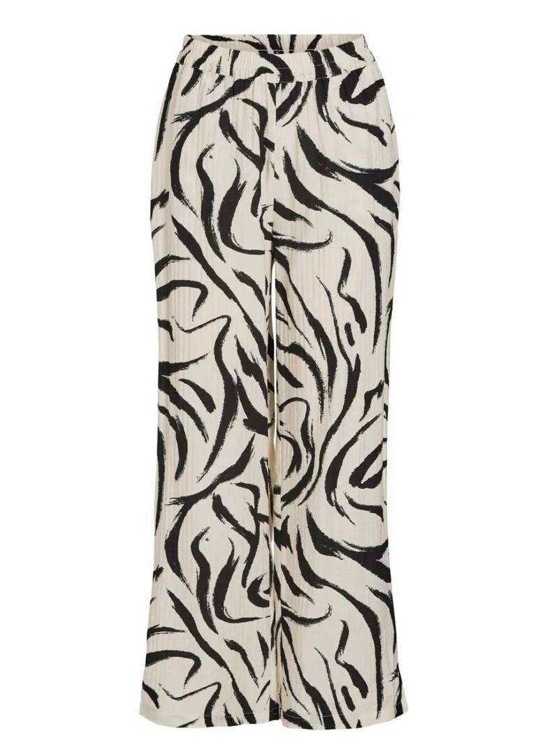 Calças Vila. Cor bege. Estampado em preto. Cintura alta. Cintura elástica. Bolsos laterais. Corte folgado. O modelo veste o tamanho 36.