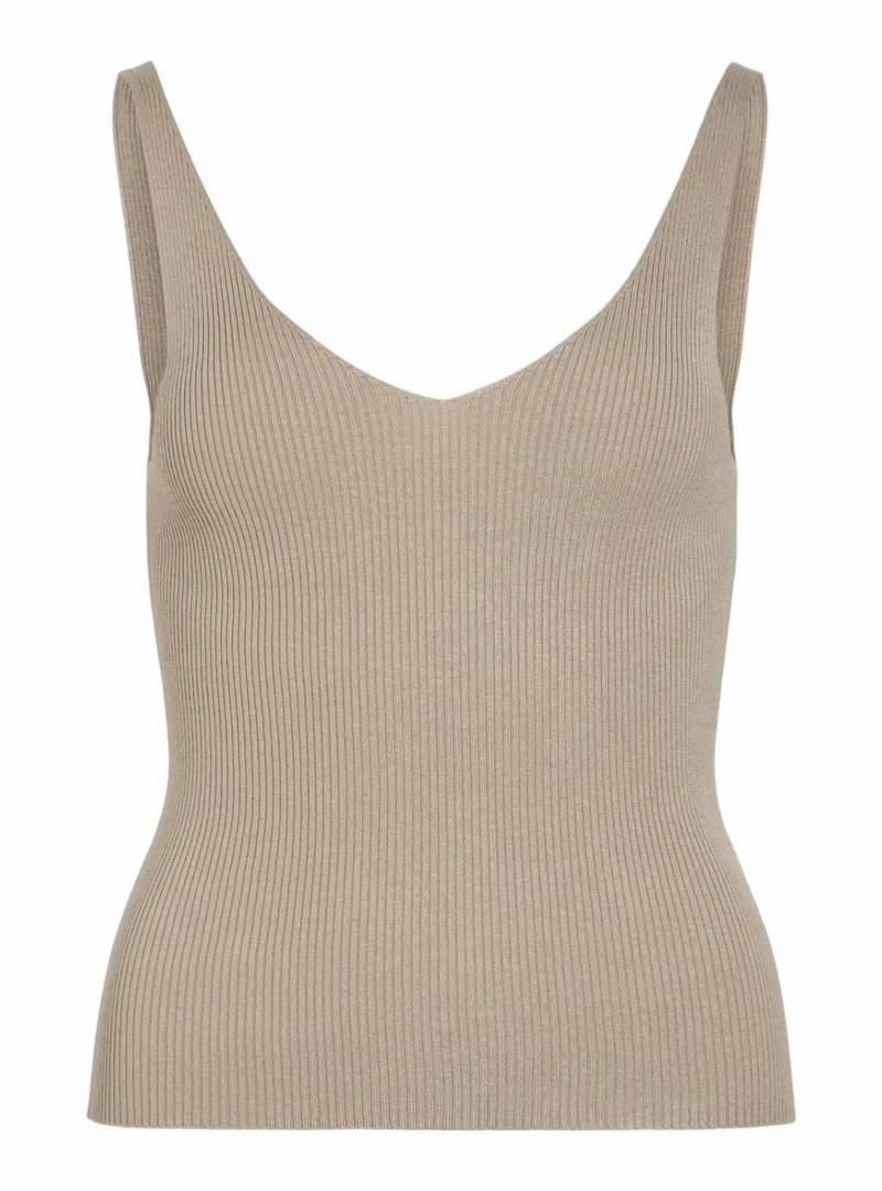 Top Vila. Cor tostado. Tecido de malha macio. Sem mangas. Decote em V. Textura canelada. Formato regular. O modelo veste o tamanho S.