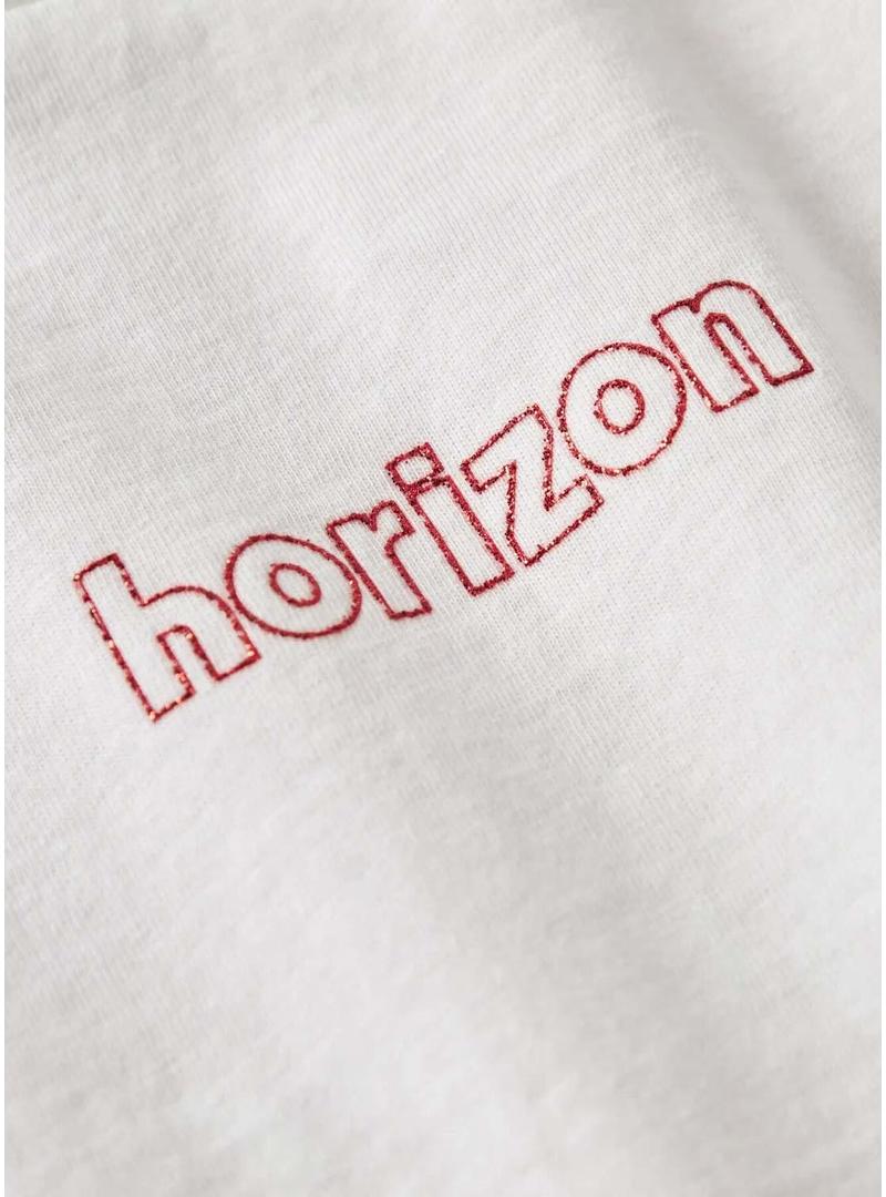 Camiseta Name It. Modelo Falaura. Ajuste regular. Cor branca. Manga curta. Ombros caídos. Detalhes em rosa e vermelho. Gola redonda elástica.