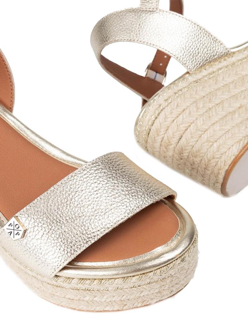 Cunha Popa. Modelo Arambol. Cor dourada. Fivela ajustável no tornozelo. Altura de 7 cm. Plataforma de 2,5 cm. Exterior de couro. Fivela ajustável. Palmilha acolchoada.