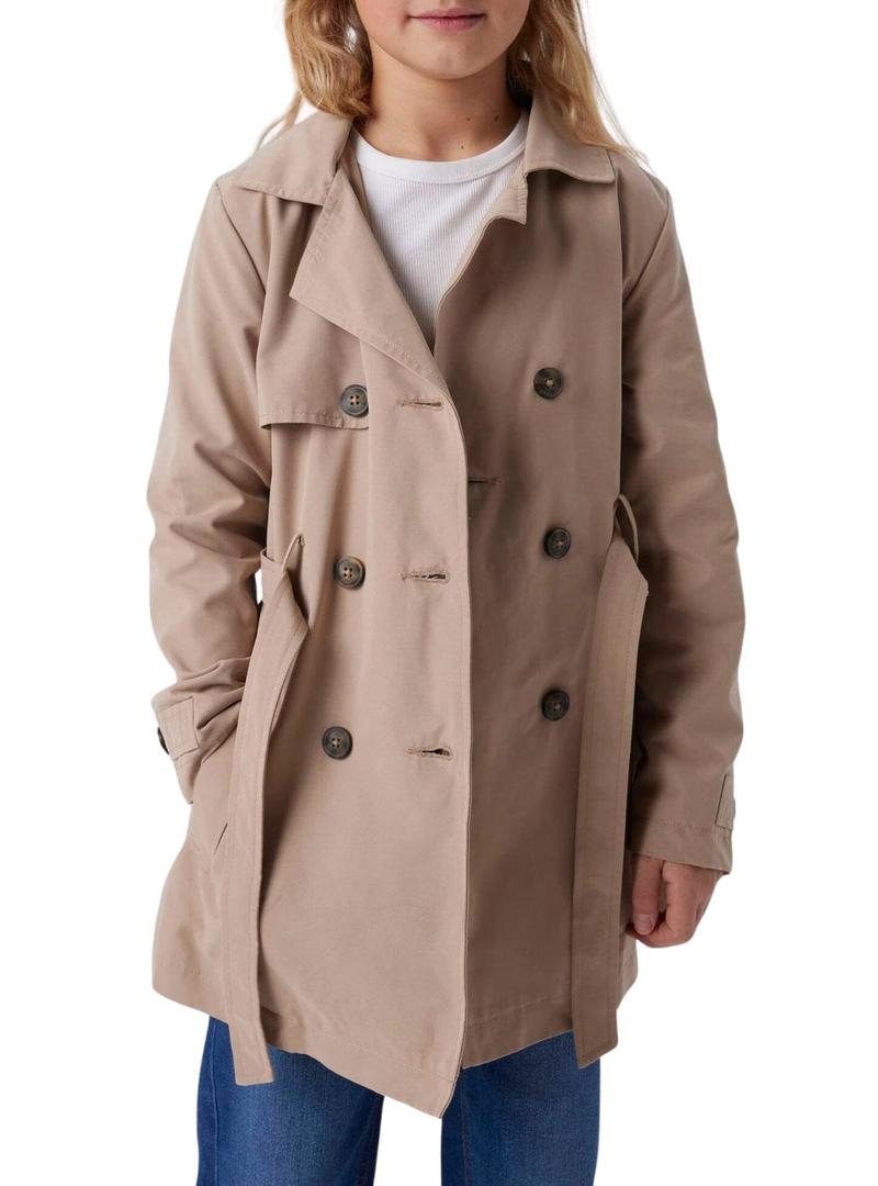 Gabardina Nome It. Modelo Madelin. Cor bege. Botões de fecho e laço. Tecido de trama. Bolsos laterais e frontais. Manga comprida.